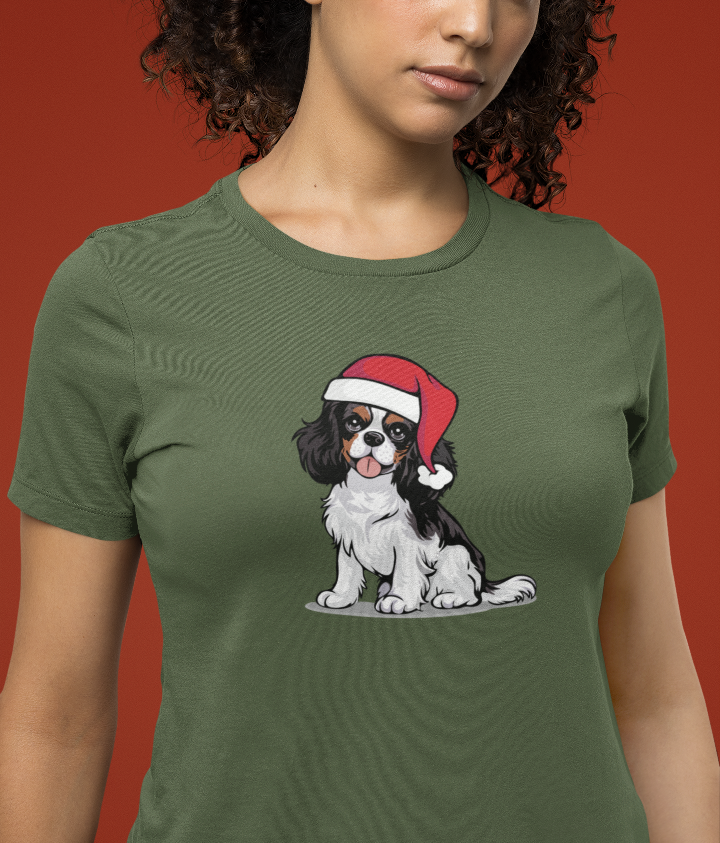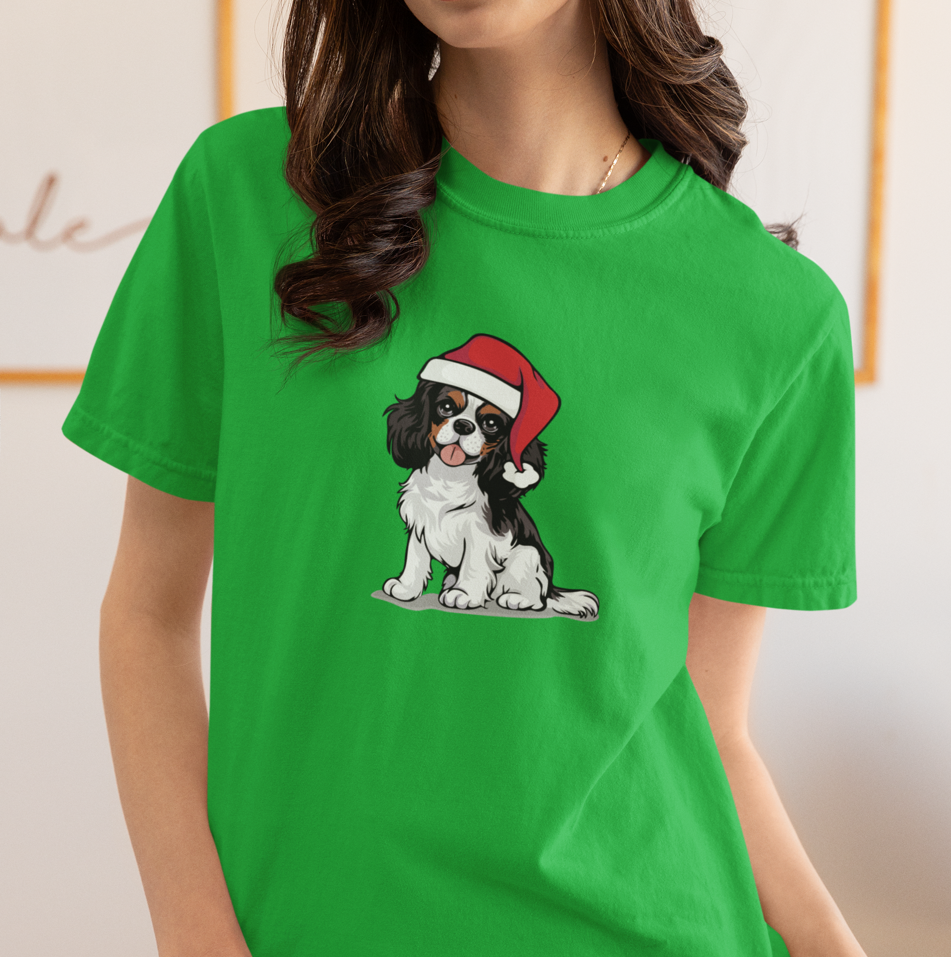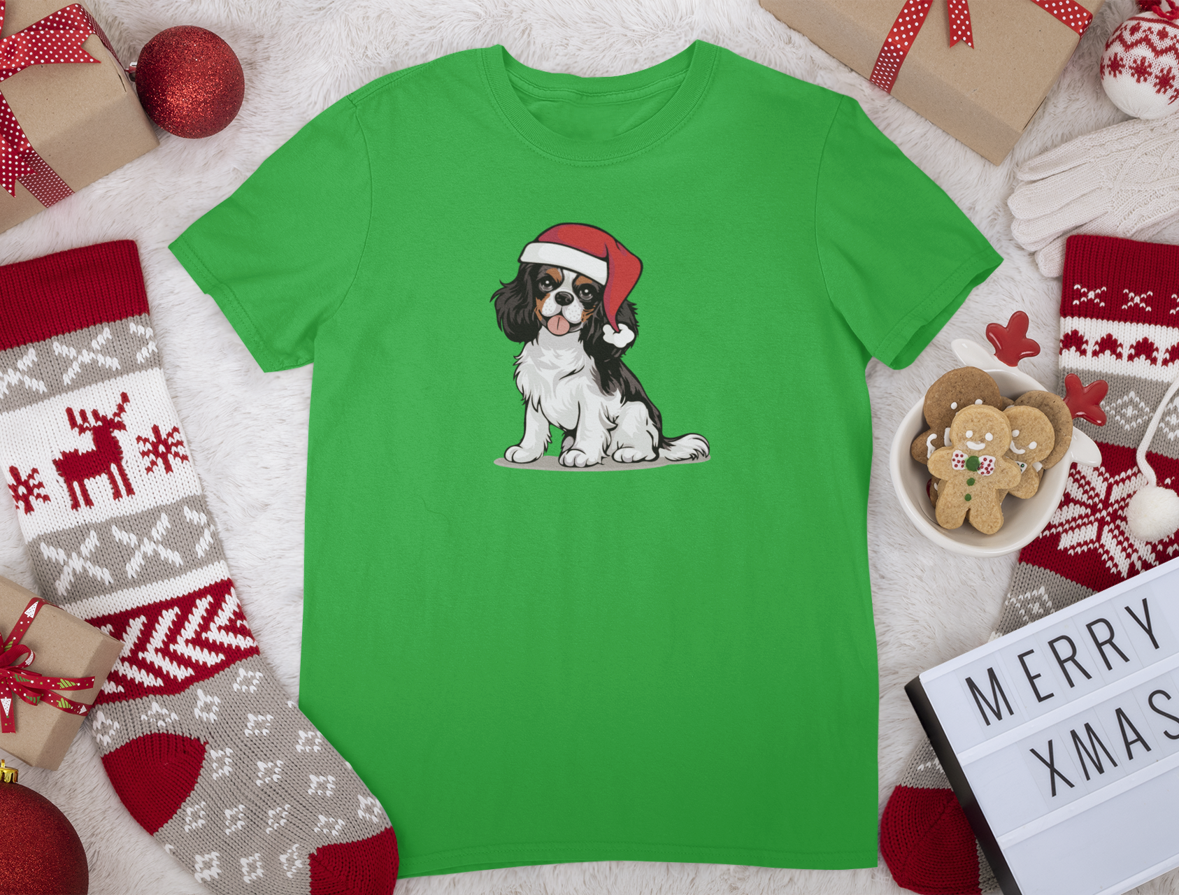A festive Christmas T-Shirt featuring a Cavalier King Charles Spaniel Dog dressed in a Santa hat. Perfect for adding a touch of holiday spirit and cheer to any wardrobe. Cotton t-shirt with unisex fit for both men and women. Ideal for those who love Christmas and cute dog & animal designs. A fun holiday gift for a Cavalier King Charles Spaniel lover in your life.