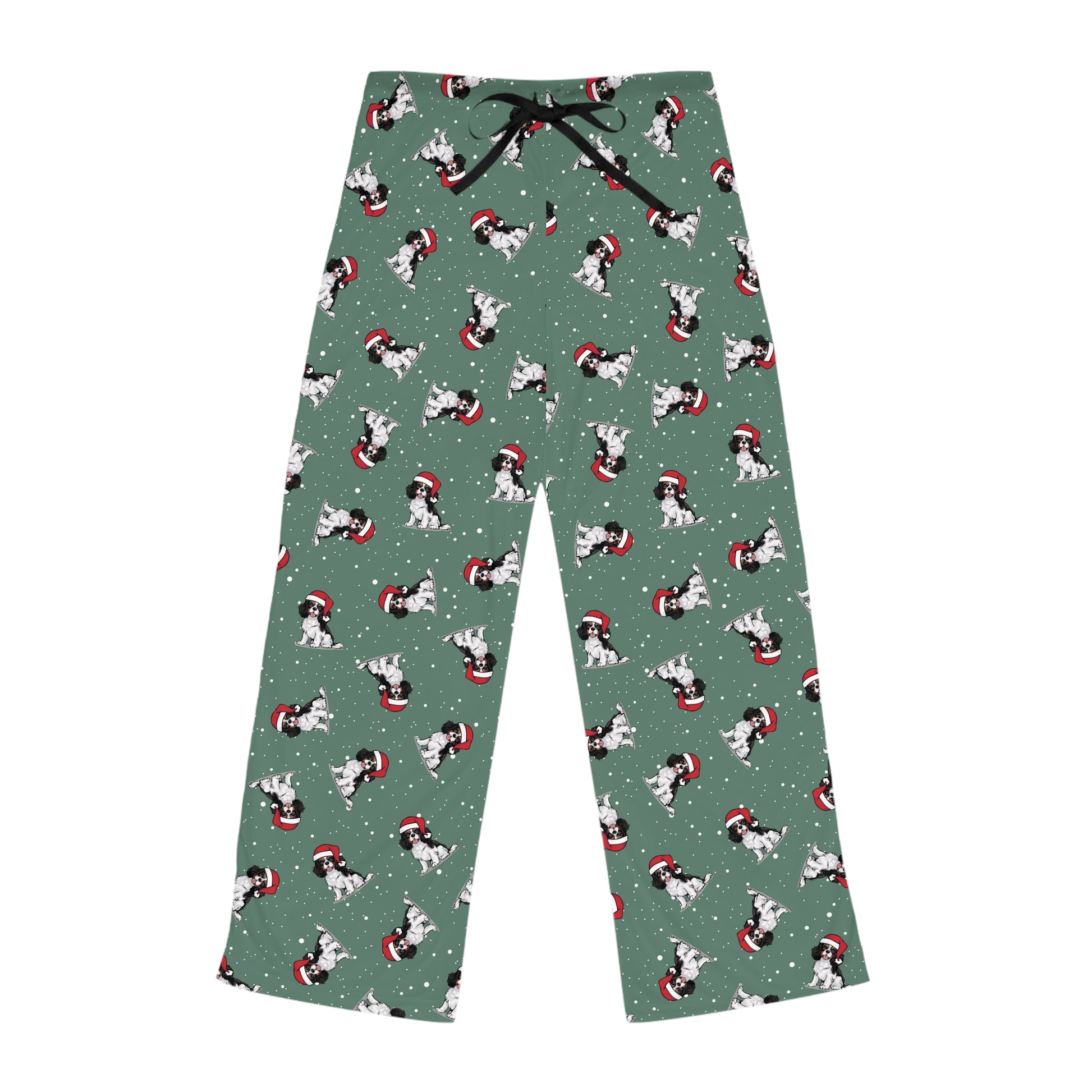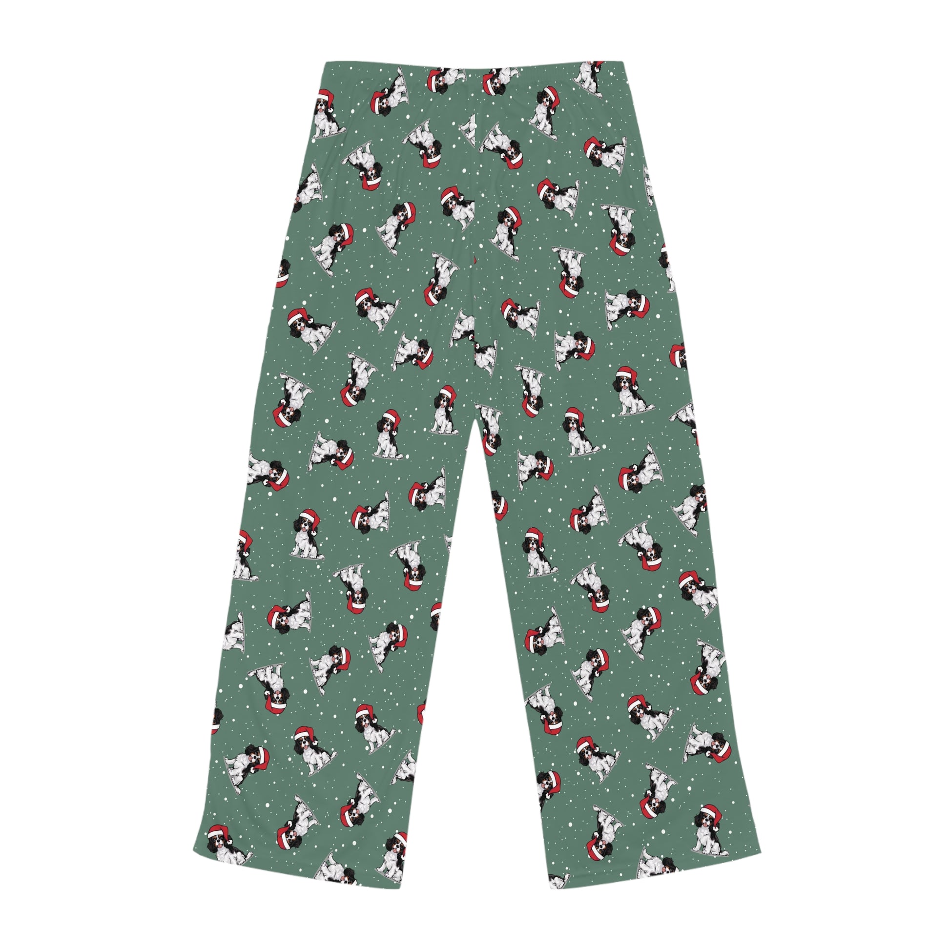 Festive women's Christmas pajama bottoms featuring a pattern of Cavalier King Charles Spaniel Dog dressed in a Santa hat on a green backdrop of falling snow. Perfect for adding a touch of holiday spirit and cheer to your winter lounge wear. Cavalier King Charles Spaniel pajama pants are an ideal holiday gift for those who love Christmas and cute puppy designs. A fun holiday gift for a dog lover in your life. Cavalier King Charles Spaniel Pajama bottoms are made of 100% polyester jersey knit fabric, along with the relaxed fit, makes for the ultimate comfort choice while kicking back at home or are perfect as matching holiday pajamas to wear with your family on Christmas morning. The back elastic with the drawstring tie creates the perfect fit while the all-over doggy print adds a cozy and unique vibe to your taste. 100% polyester .: Light fabric (6 oz/yd² (203 g/m²)). Relaxed comfort fit. Back elastic and black drawstring tie.