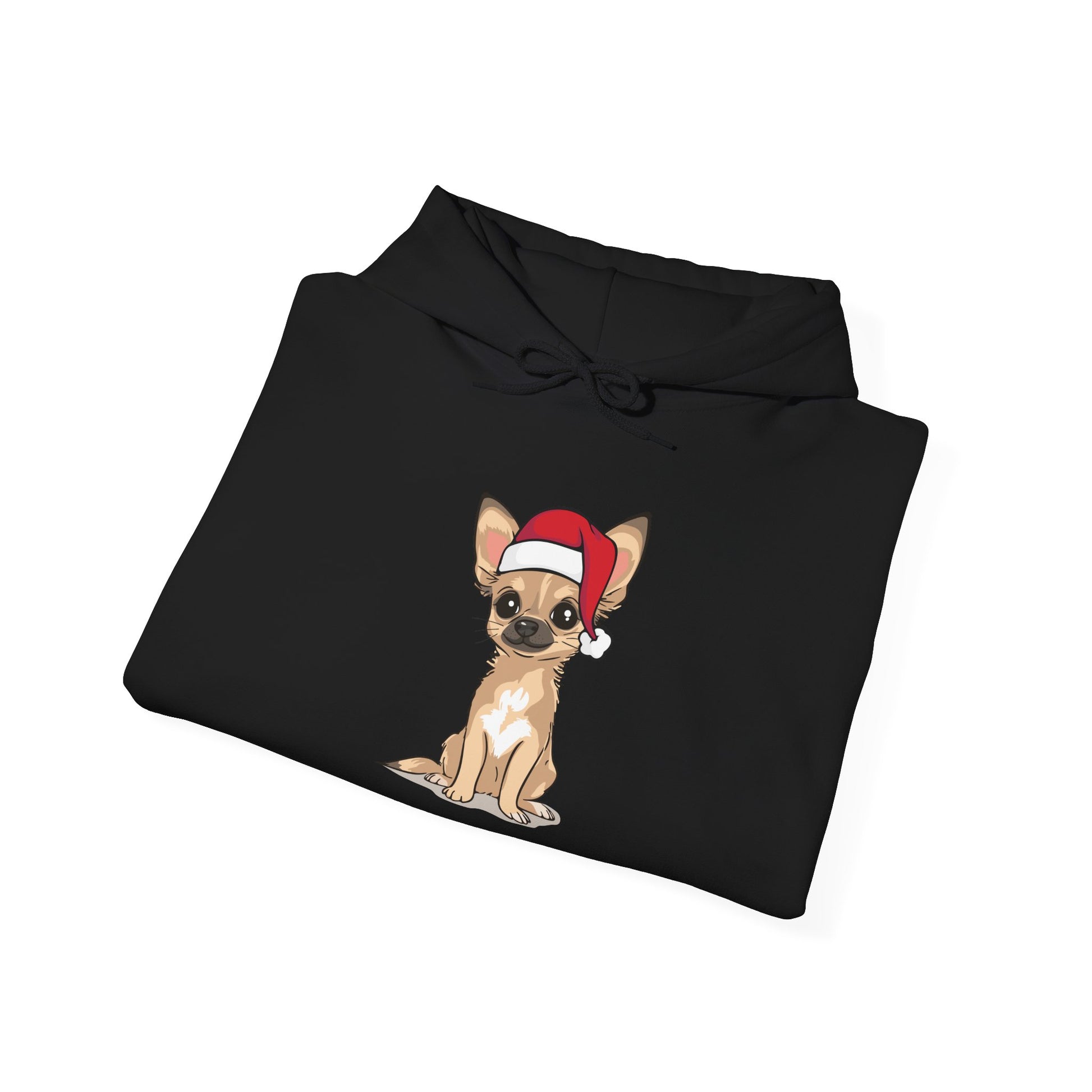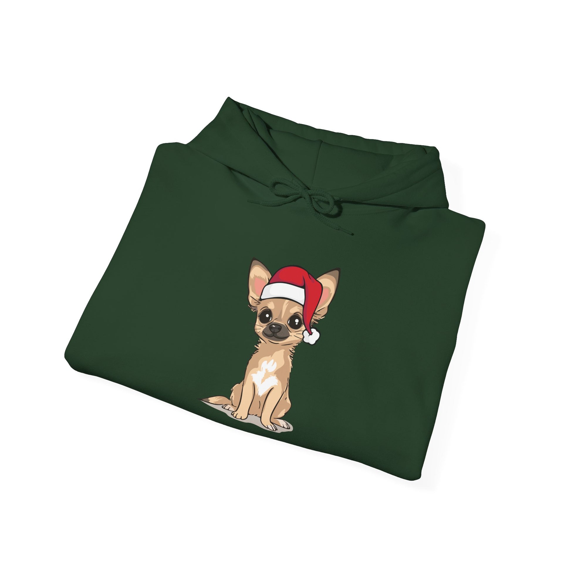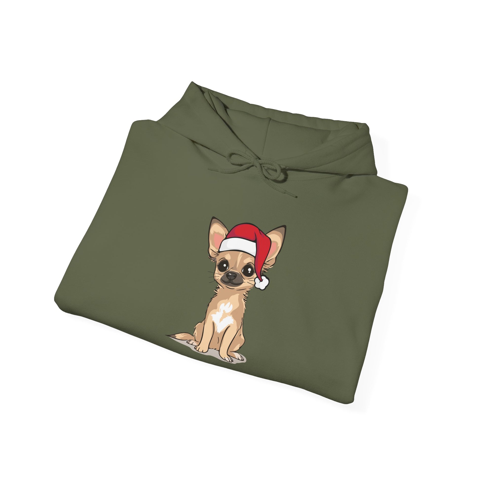 A festive Christmas pullover hoodie featuring a tan Chihuahua Puppy Dog dressed in a Santa hat. Perfect for adding a touch of holiday spirit and cheer to any wardrobe. Cozy hooded sweatshirt with unisex fit for both men and women. Ideal for those who love Christmas and cute pet and animal designs. A fun holiday gift for a chihuahua owner or lover in your life. Hoodie also available in children's sizes so the whole family can have matching Christmas outfits. 50% cotton, 50% polyester (fiber content varies for different colors). Regular fit, Cozy fleece inside.