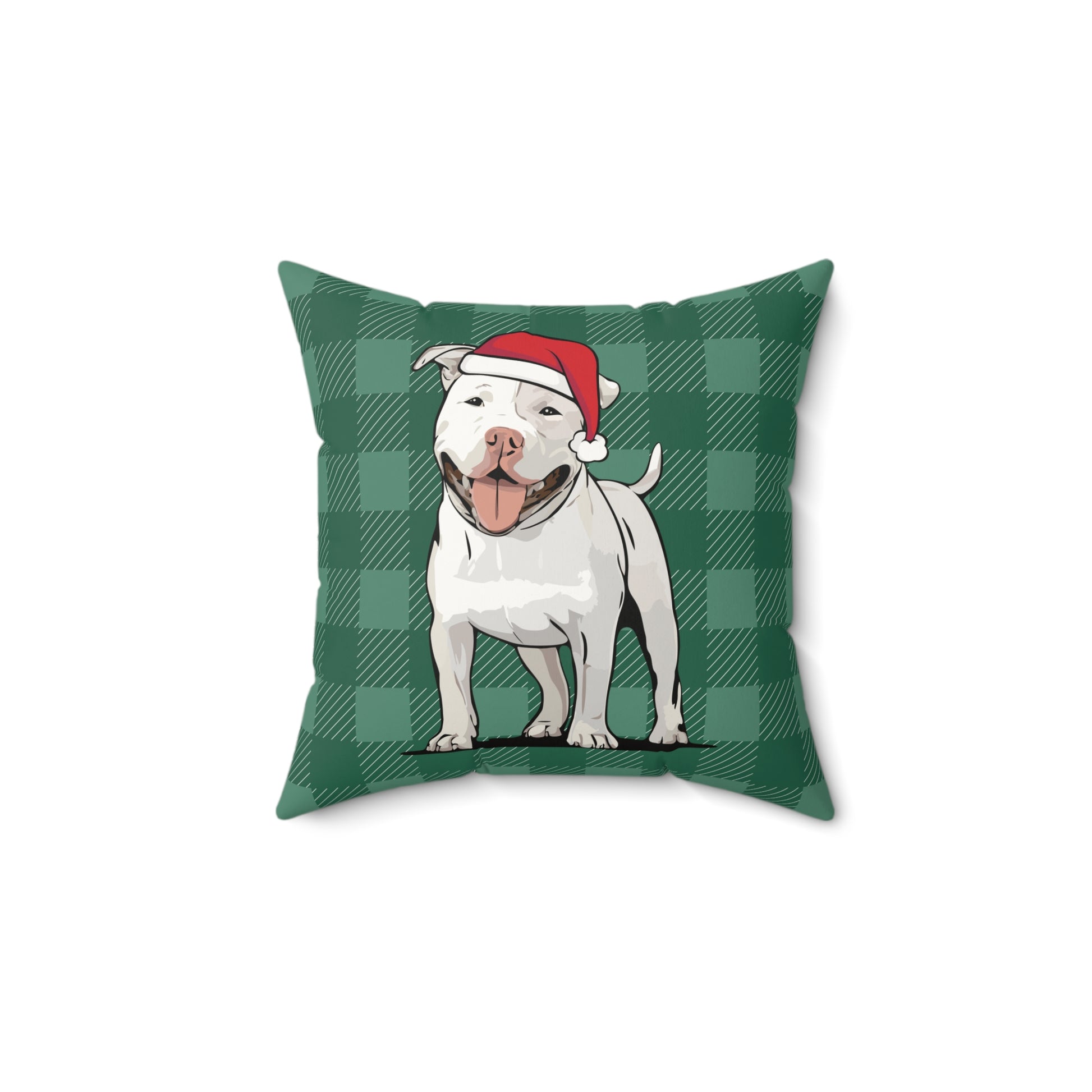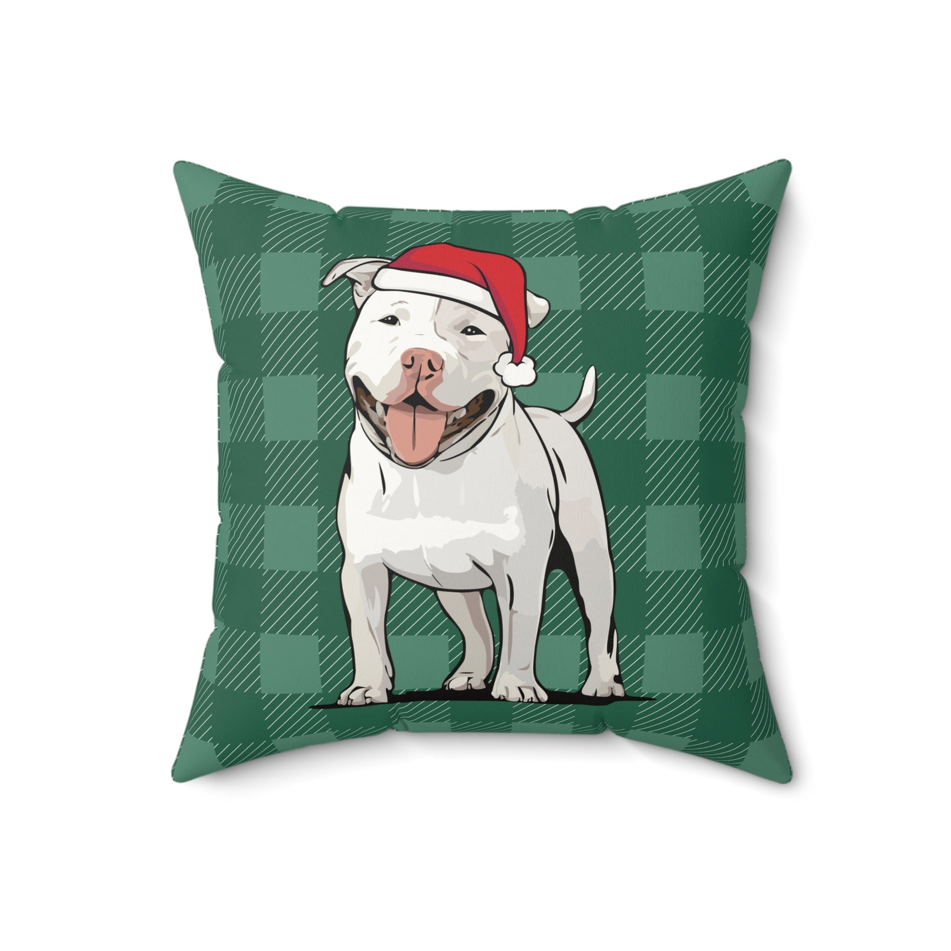 Transform your cozy winter living space with this charming white Pit Bull Dog faux suede square throw pillow featuring an adorable dog in a festive Santa hat. This festive throw pillow adds a touch of whimsy and warmth to any room decor, perfect for snuggling up on the couch or adding a seasonal pop of color to your bed. Its playful design effortlessly complements holiday decorations, making it an ideal accent piece for Christmas gatherings or cozy winter nights. Makes a unique gift for Pit Bull terrier dog lovers and anyone looking to spread holiday cheer, this pillow also makes a thoughtful gift for friends and family during seasonal celebrations, housewarming events, or birthdays. Elevate your home decor while embracing the festive spirit!