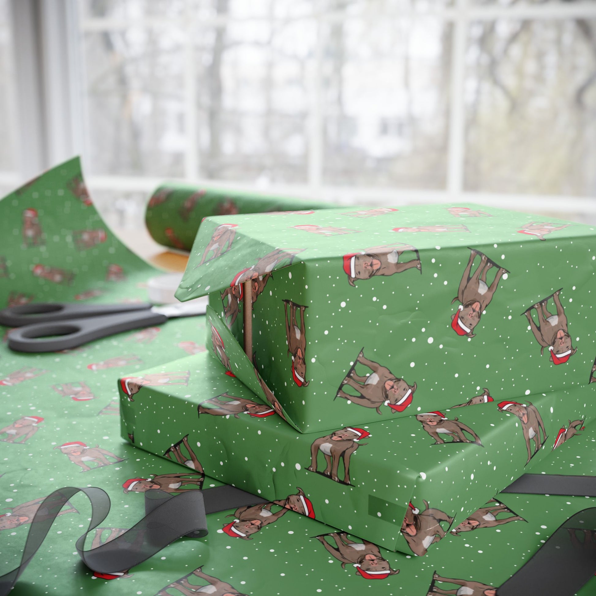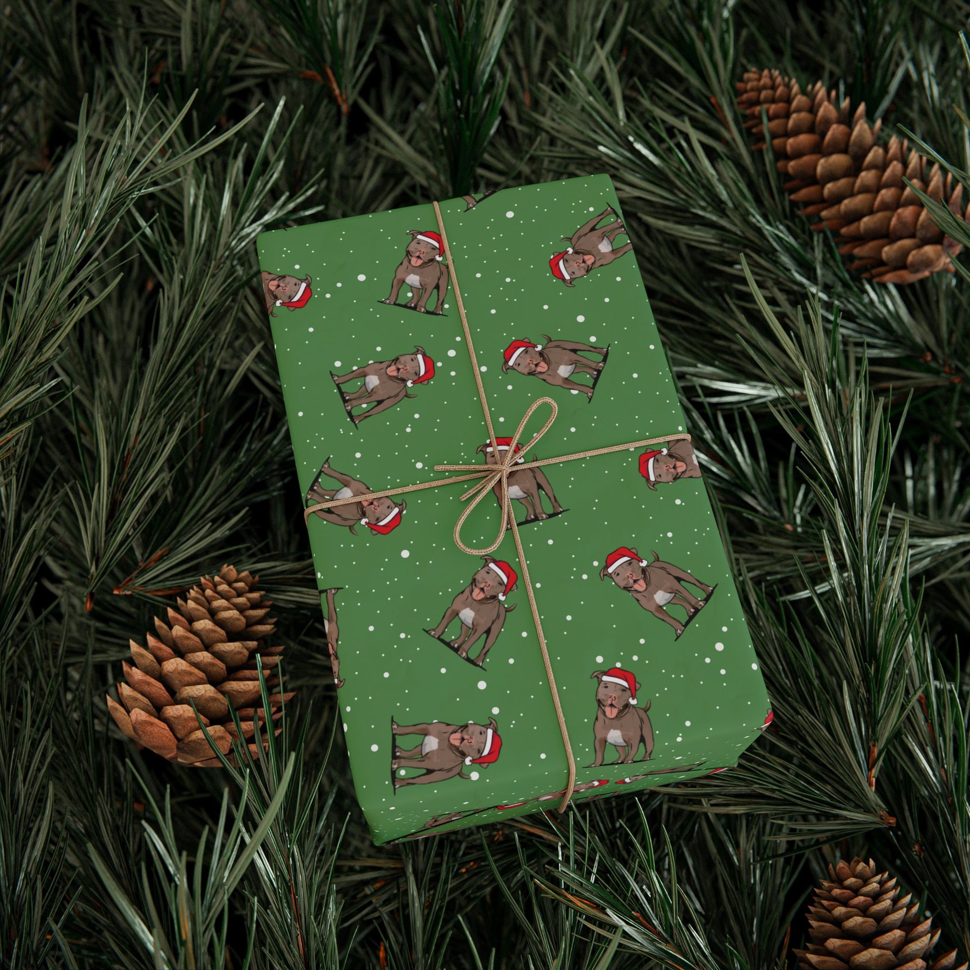 Wrap your gifts in style with our vibrant Pitbull dog pattern green wrapping paper. Each design captures a festive vibe featuring pit bull terrier dogs in Santa hats, perfect for the holiday season for a pitbull owner or lover. Ideal for anyone who loves to add a personal touch to their presents, this wrapping paper will bring joy to both the giver and receiver. It's a great choice for Christmas and other gift giving occasions in winter that call for that extra canine flair. Enjoy the art of gift-giving with a product that makes every wrapped gift an experience!