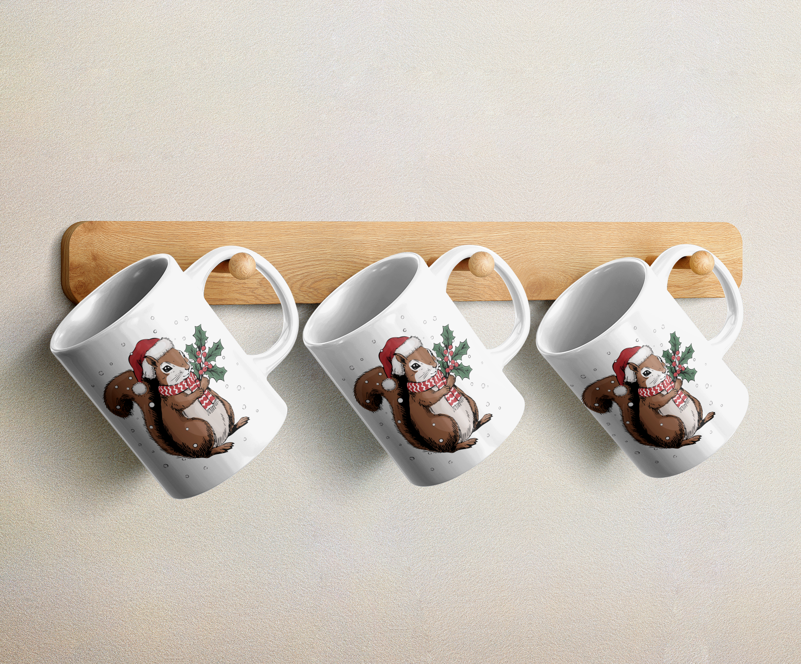 A festive Christmas ceramic coffee mug featuring a squirrel dressed in a Santa hat and scarf, holding holly in the falling snow. Perfect for adding a touch of holiday spirit and cheer to your morning coffee or tea. Ideal for those who love Christmas and cute animal designs. A fun holiday gift for a squirrel lover in your life.