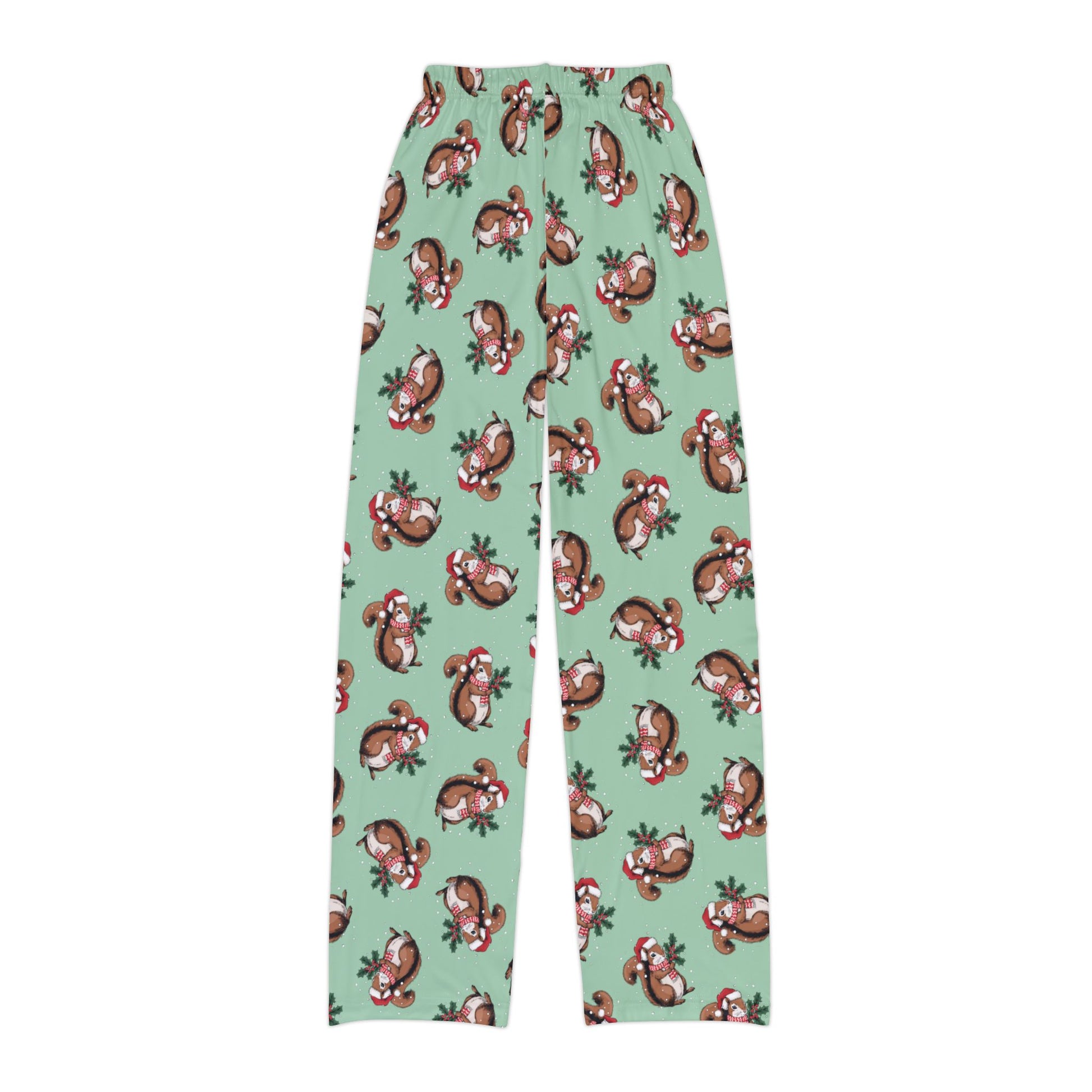 Festive kid's Christmas pajama bottoms featuring a pattern of squirrels dressed in a Santa hat and scarf, holding holly in the falling snow. Perfect for adding a touch of holiday spirit and cheer to your child's winter lounge wear. Sage green squirrel pajama pants are an ideal holiday gift for those who love Christmas and cute animal designs. A fun holiday gift for a squirrel lover in your life.