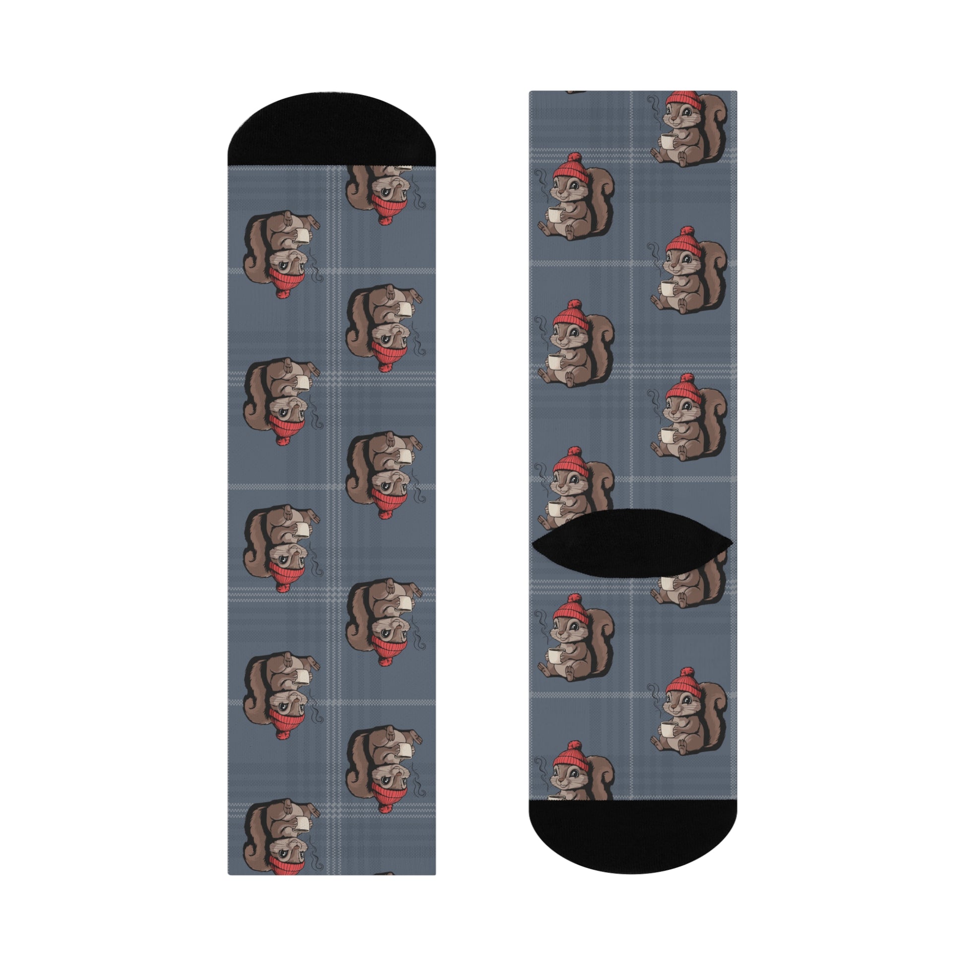 Cozy Squirrel Plaid Crew Socks, Blue Plaid Squirrels Pattern Novelty Footwear, Fun Fall Winter Accessories, Cushioned Socks Unisex