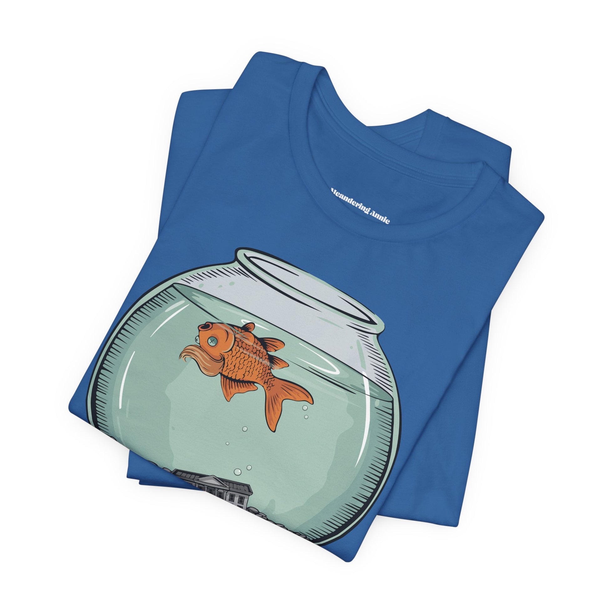 Funny political tee featuring an orange goldfish floating upside down in a glass fishbowl. In these stressful and uncertain times, sometimes we just need to find some humor and subtly (or not so subtly) make our stance known. The perfect t-shirt to wear to the next rally, protest, march, or parade. Or keep on hand or as a gift for friend for when "it" happens.
