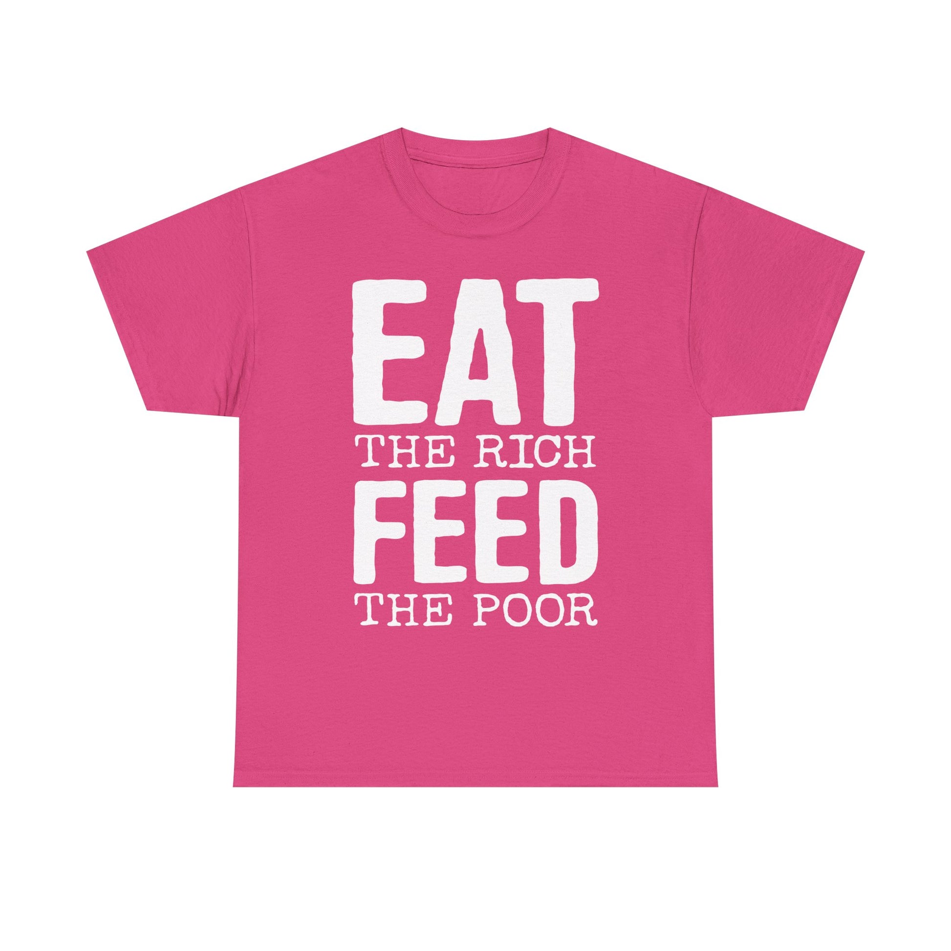 Make a statement and let your voice be heard with this Eat The Rich Feed The Poor Cotton T-shirt. The unisex heavy cotton tee for both men and women. No side seams mean there are no itchy interruptions under the arms. The shoulders have tape for improved durability.