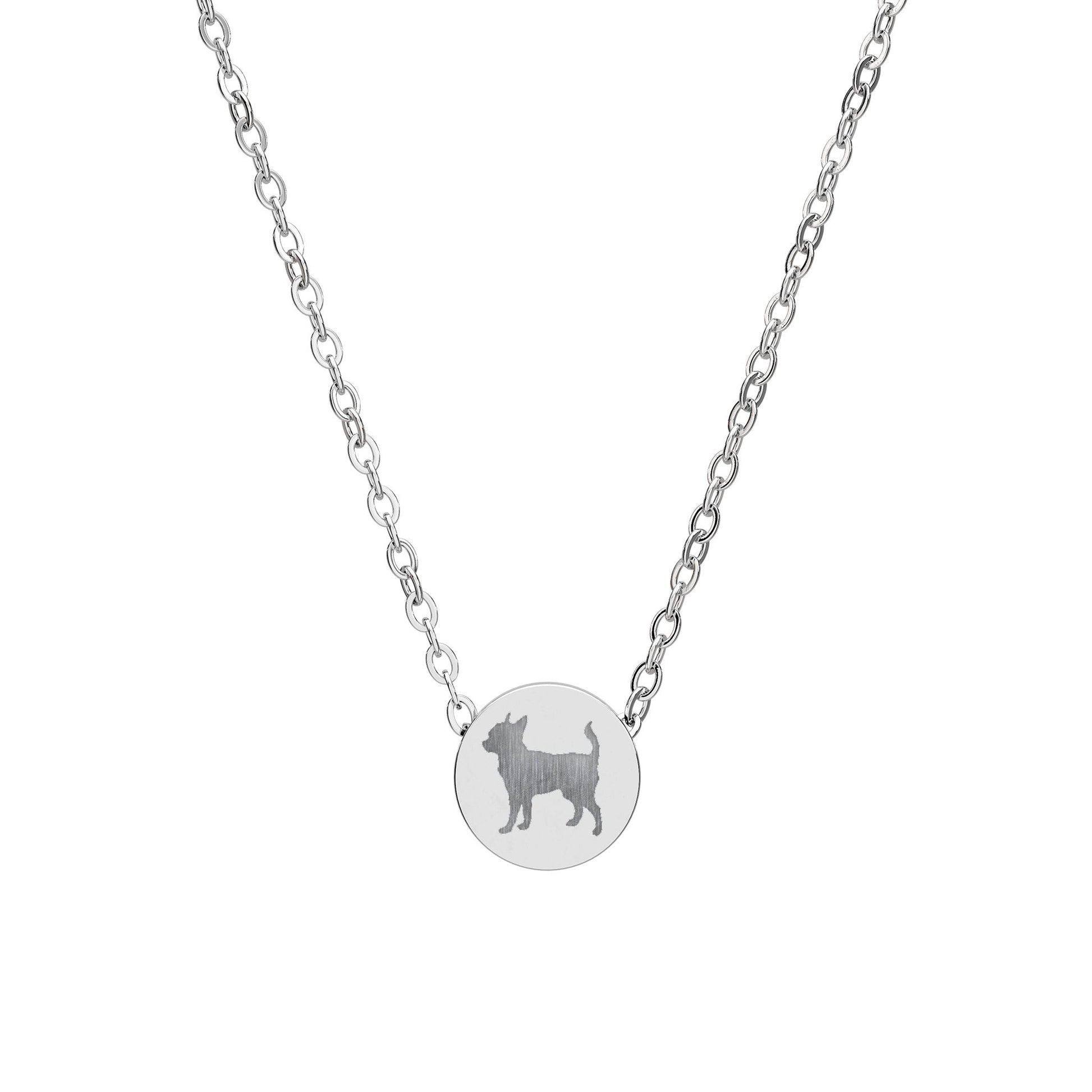 A delicate, everyday mini circle necklace that carries a small story close to the heart. The tiny round pendant catches light without shouting, and its clean surface is ready for engraving or a subtle etched motif — like the small Chihuahua dog silhouette shown — that feels personal and quietly meaningful. Lightweight on the neck, it layers easily with other pieces or stands alone as a low-key signature. The surgical-grade stainless steel construction keeps the shine steady through daily wear, while hypoallergenic properties let sensitive skin wear it confidently. This piece sits well with those who favor understated, sentimental jewelry — worn on morning walks, at casual meetups, or tucked beneath a sweater on chilly days when comfort matters most.