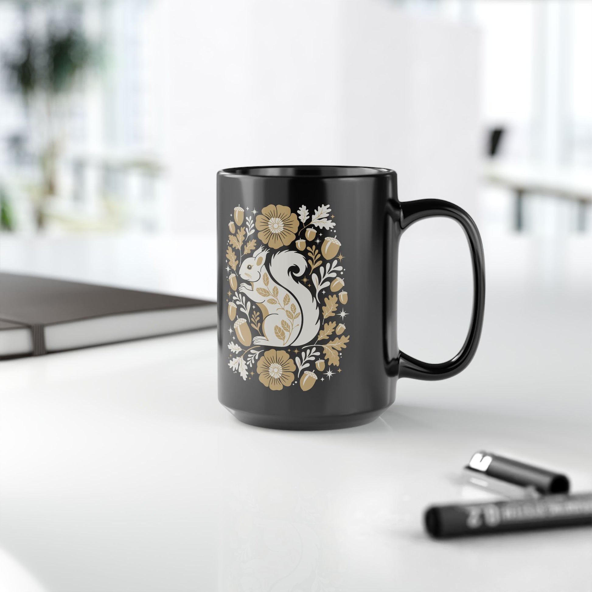 This 15 ounce glossy black ceramic mug brings a quiet, cozy charm to slow mornings and late-night tea. A delicate cream-and-gold floral vignette frames a stylized squirrel, its curled tail woven into leaves and acorns - an earthy, cottage-core motif that reads like a small folk illustration on deep black. The rich black background makes the warm tones pop, giving every sip a little moment of calm. It sits comfortably in hand thanks to a C-shaped handle and the glossy finish catches light like a little keepsake on your shelf or desk. Durable enough for daily use, it takes heat and the dishwasher with no fuss, so it stays as vibrant as the day you bought it.