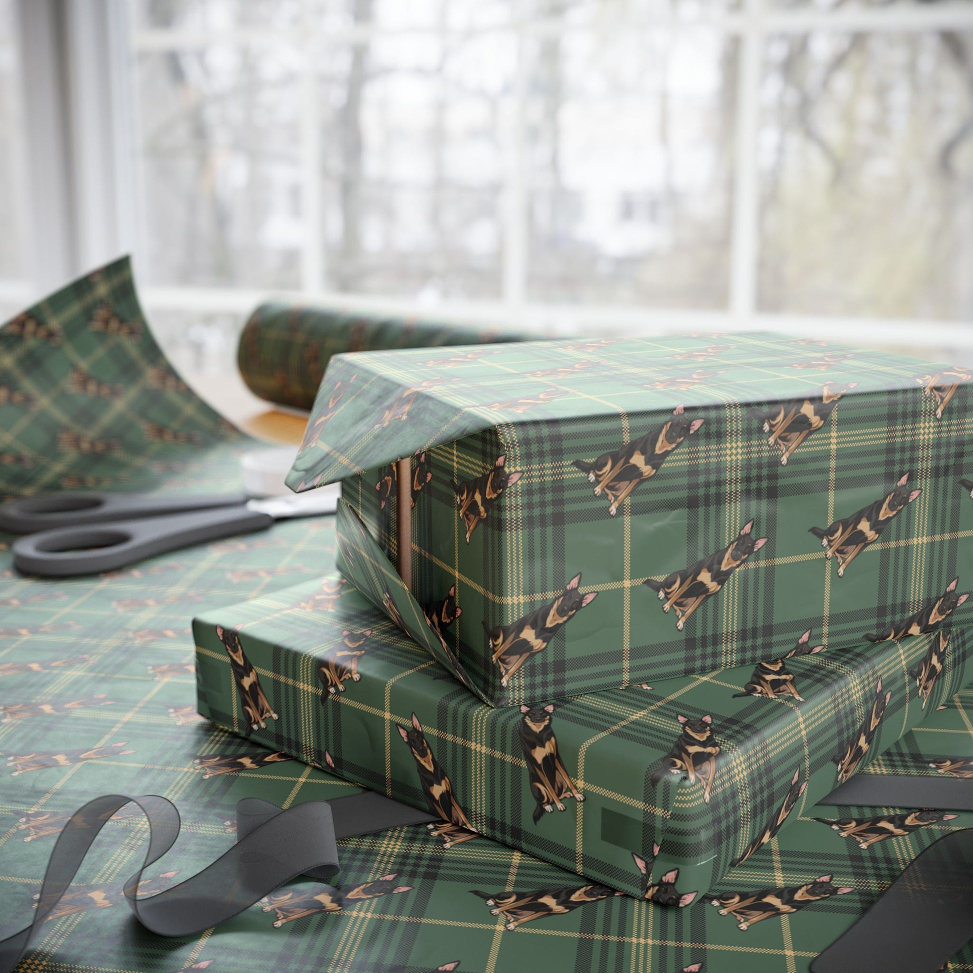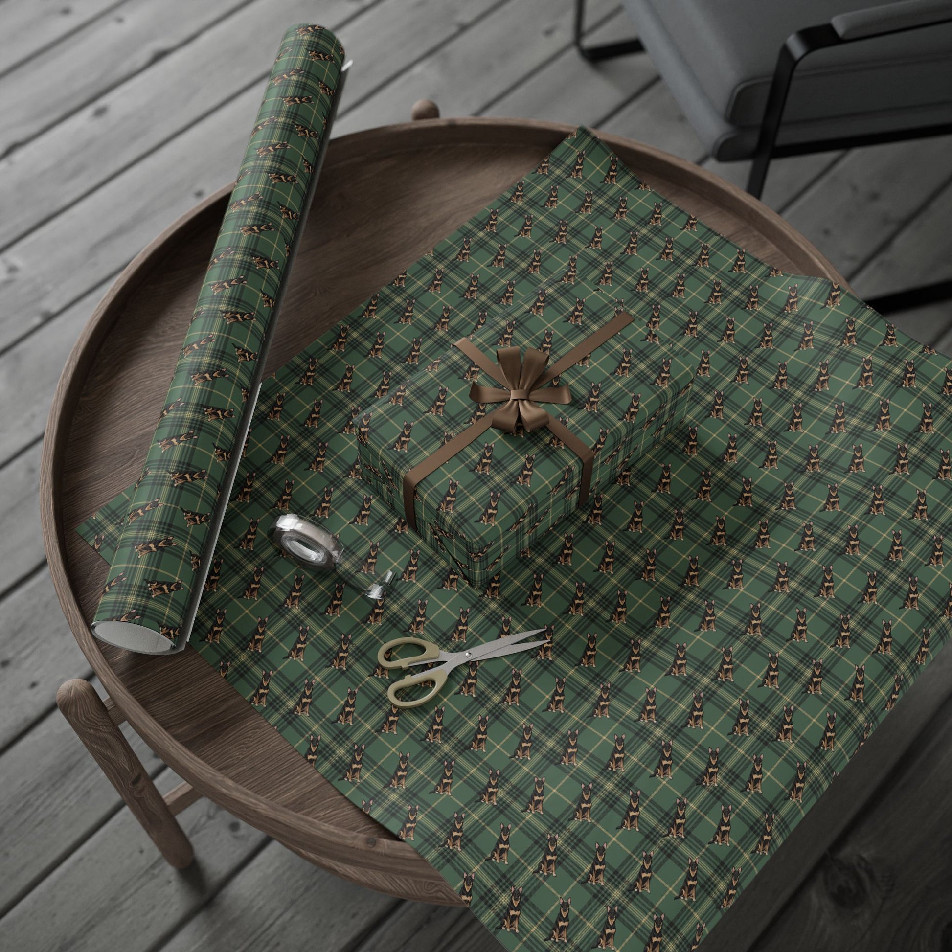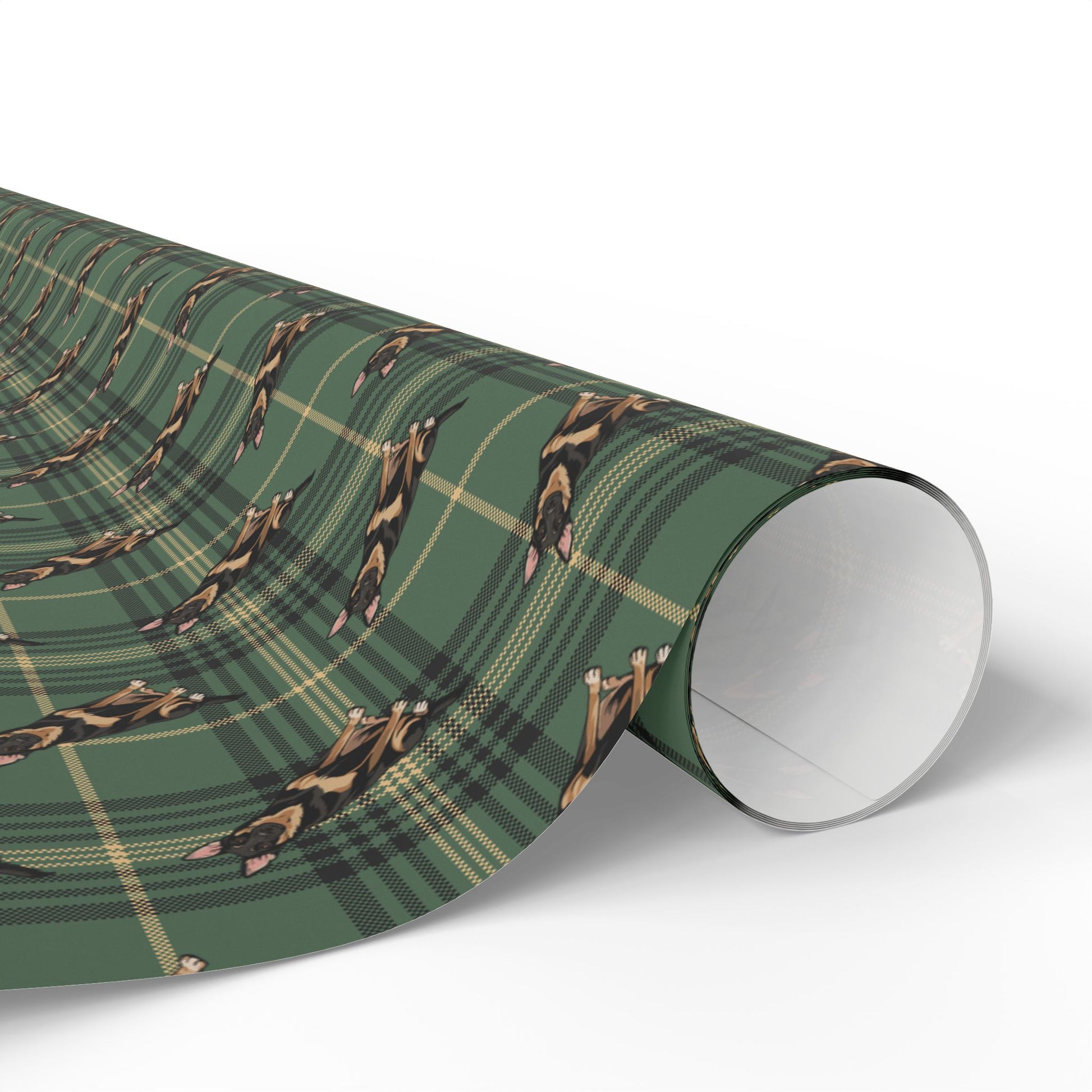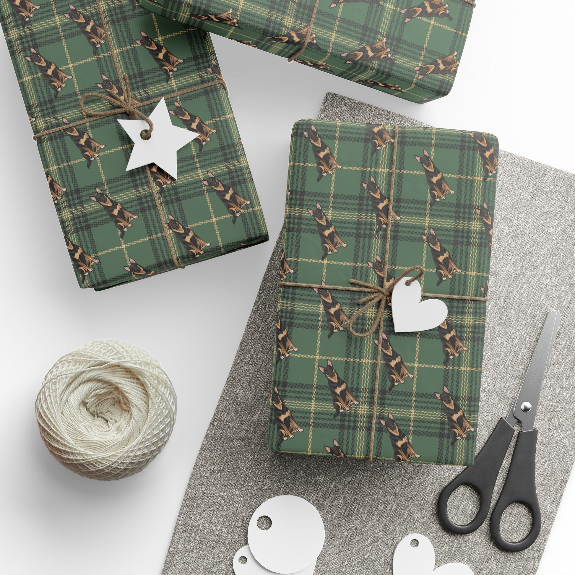German Shepherd Dog Wrapping Paper, Green Plaid Dogs Print Gift Wrap Roll, Christmas Holiday Birthday Matte Wrapping Papers
