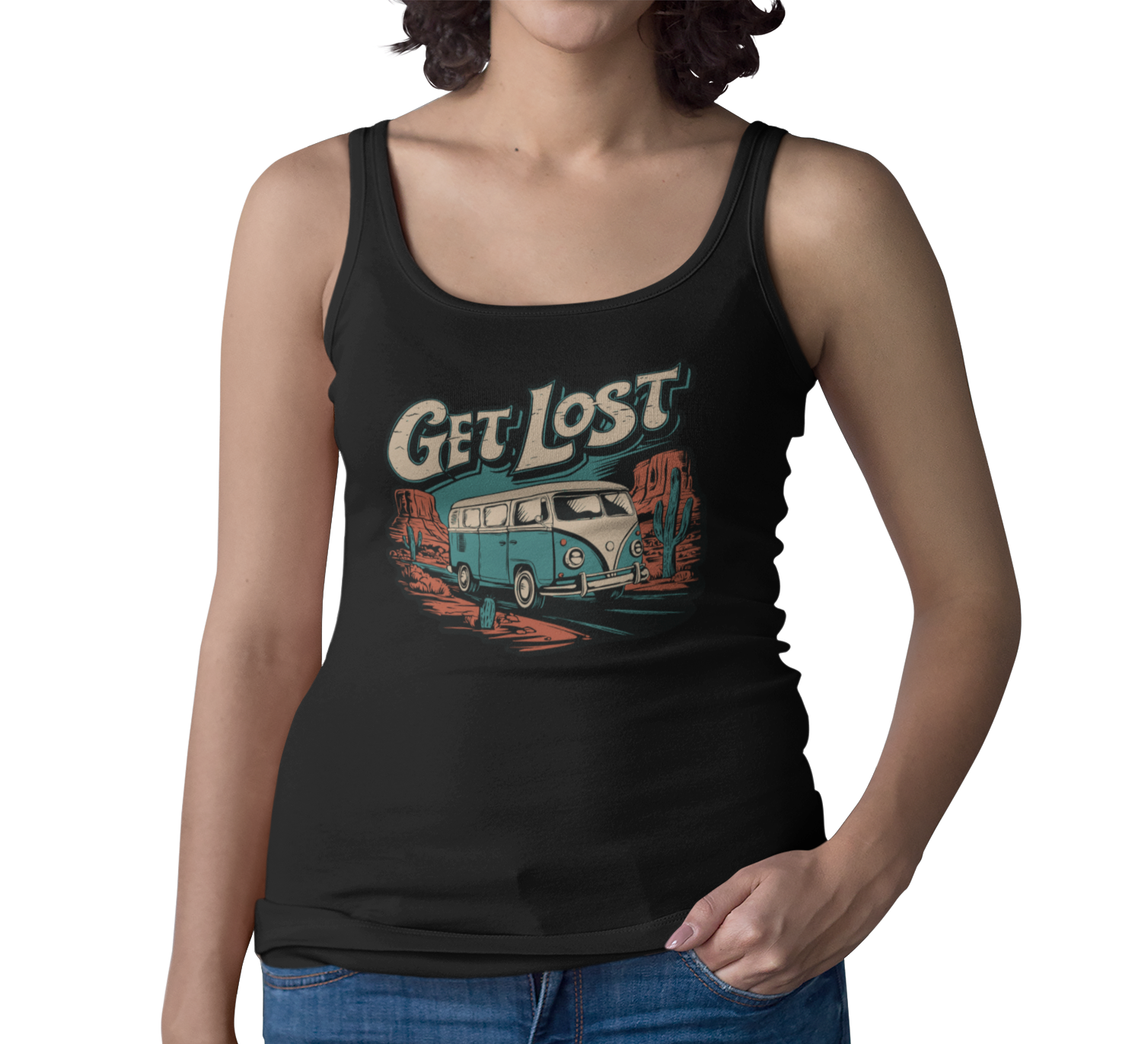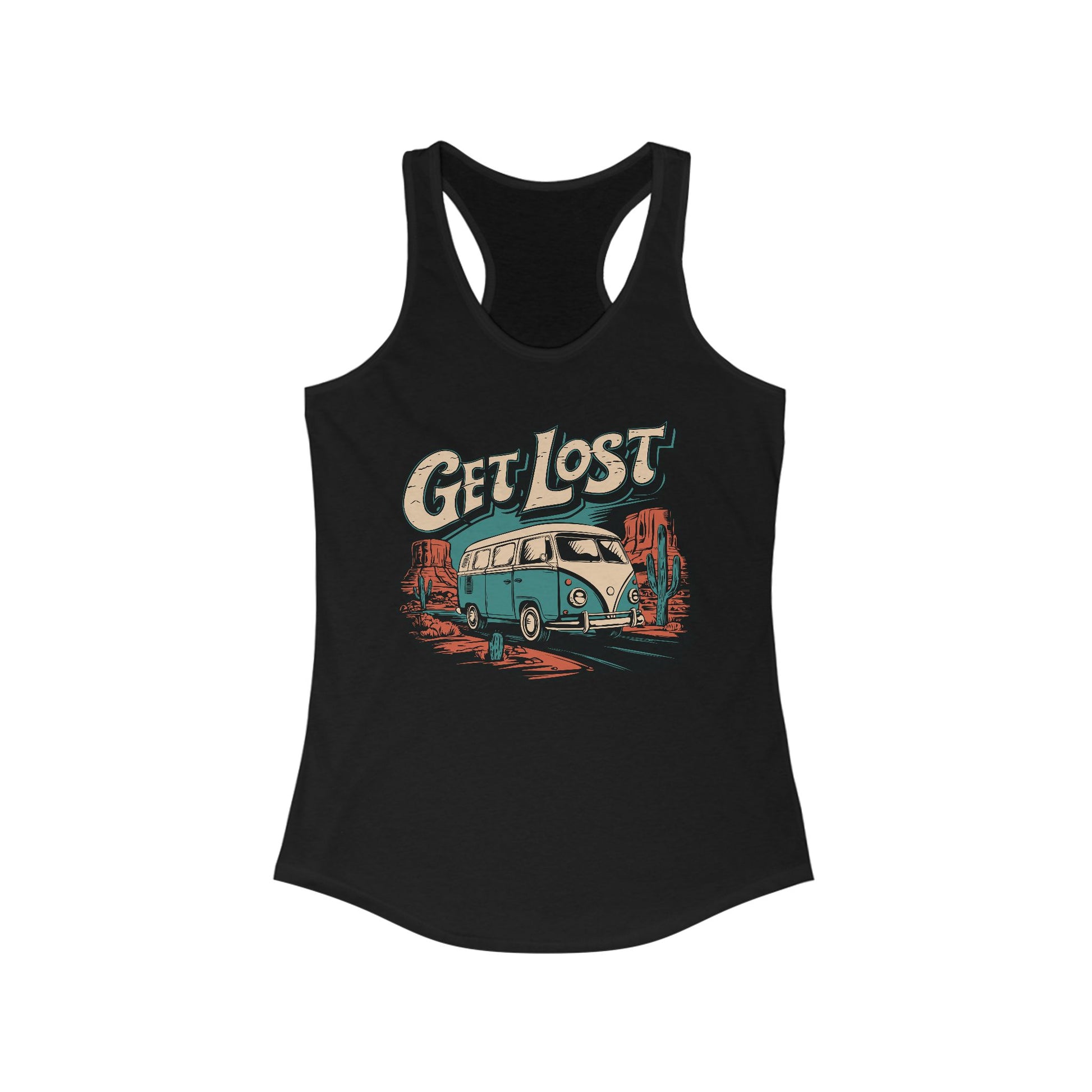 Women's tank top with Get Lost - retro camper van desert roadtrip print. The racerback cut looks good on any woman's shoulders. The perfect shirt to wear on a camping trip or to a vanlife gathering. Makes a great gift for a vintage camper van fan or a van life nomad.