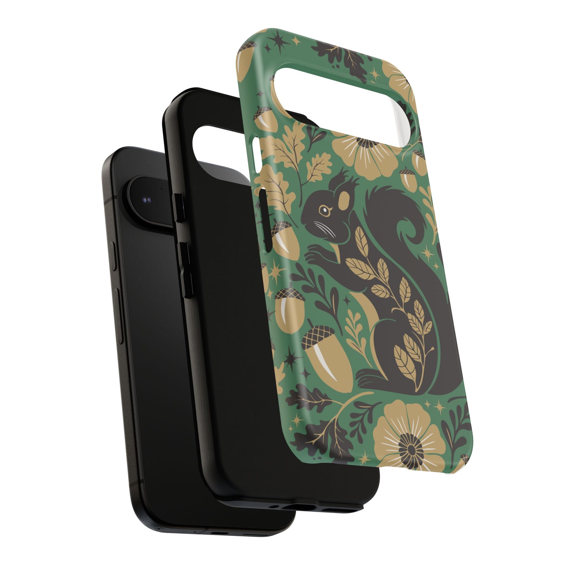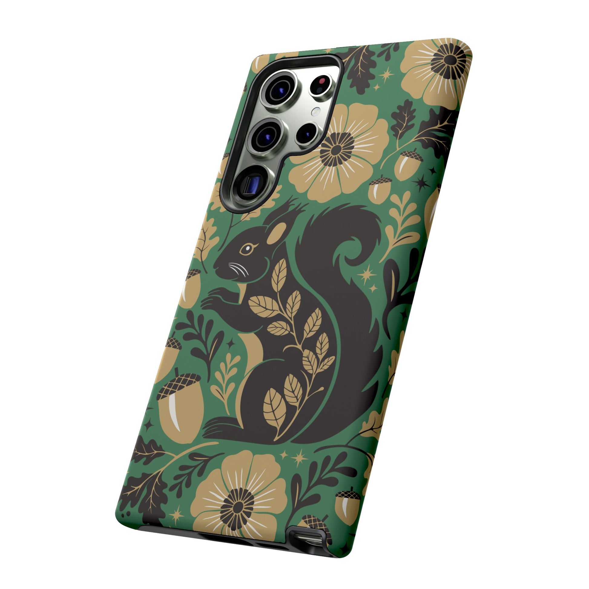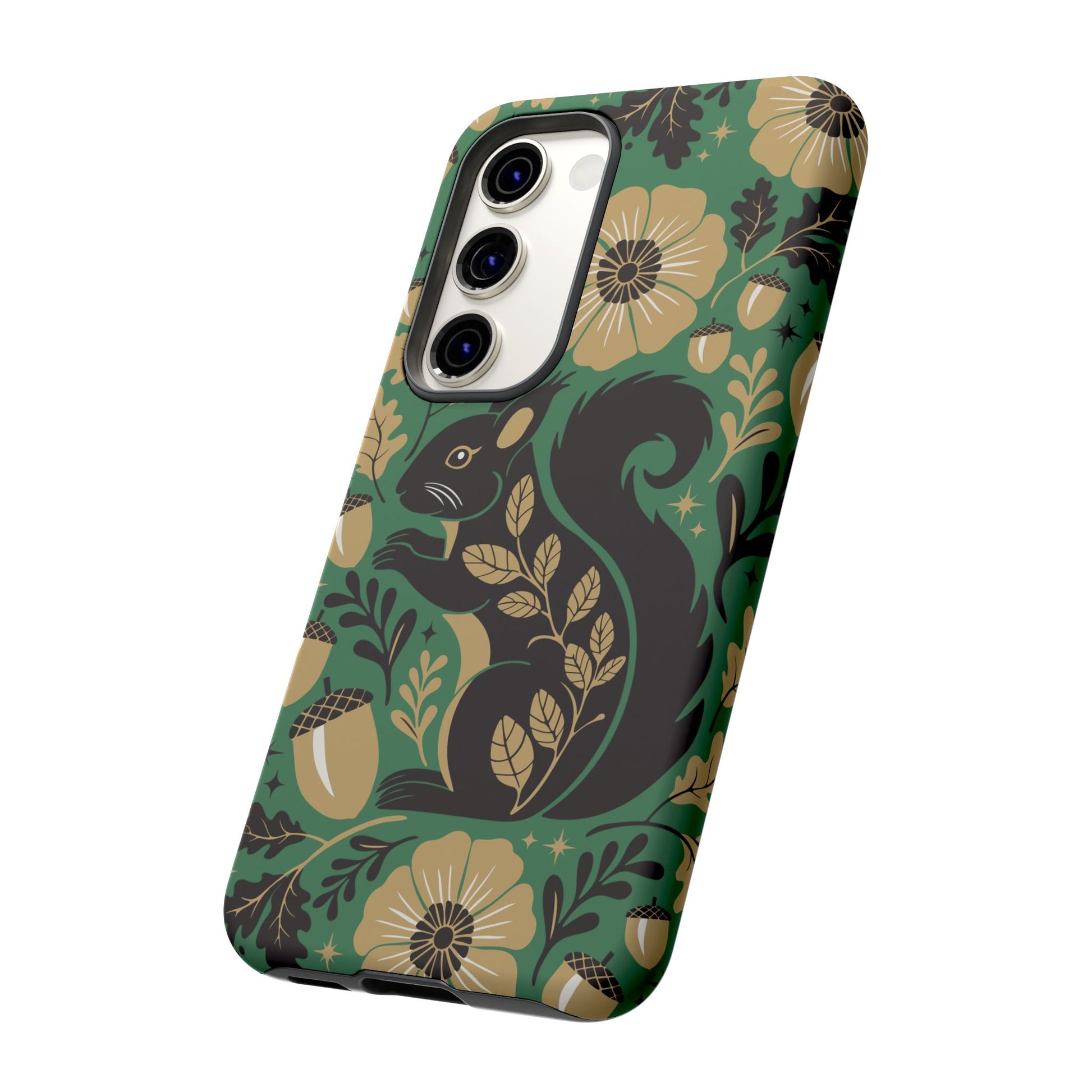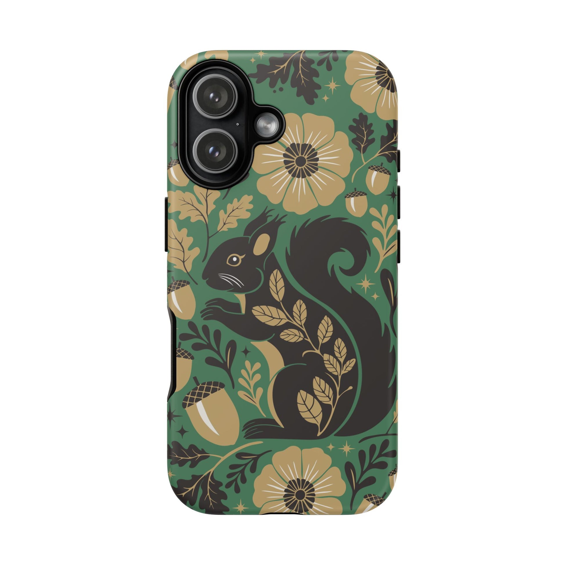 A slim, dual-layer protective phone case that pairs vintage squirrel folk-art charm with modern protection. The design features a hand-drawn black squirrel nestled among stylized floral blooms, leaves, and acorns on a deep matte green backdrop, with warm gold and cream accents that catch the eye. The matte finish keeps colors vivid while a soft TPU liner cushions against drops. This case slips easily into daily life, from commuting to coffee shop sketching, and keeps ports open for charging while supporting wireless charging. Weather-resistant coatings protect the print from UV and outdoor wear; follow simple care steps to keep the colors rich and the lining pristine. Multiple phone models available for Iphone, Samsung, and Google Pixel phones.