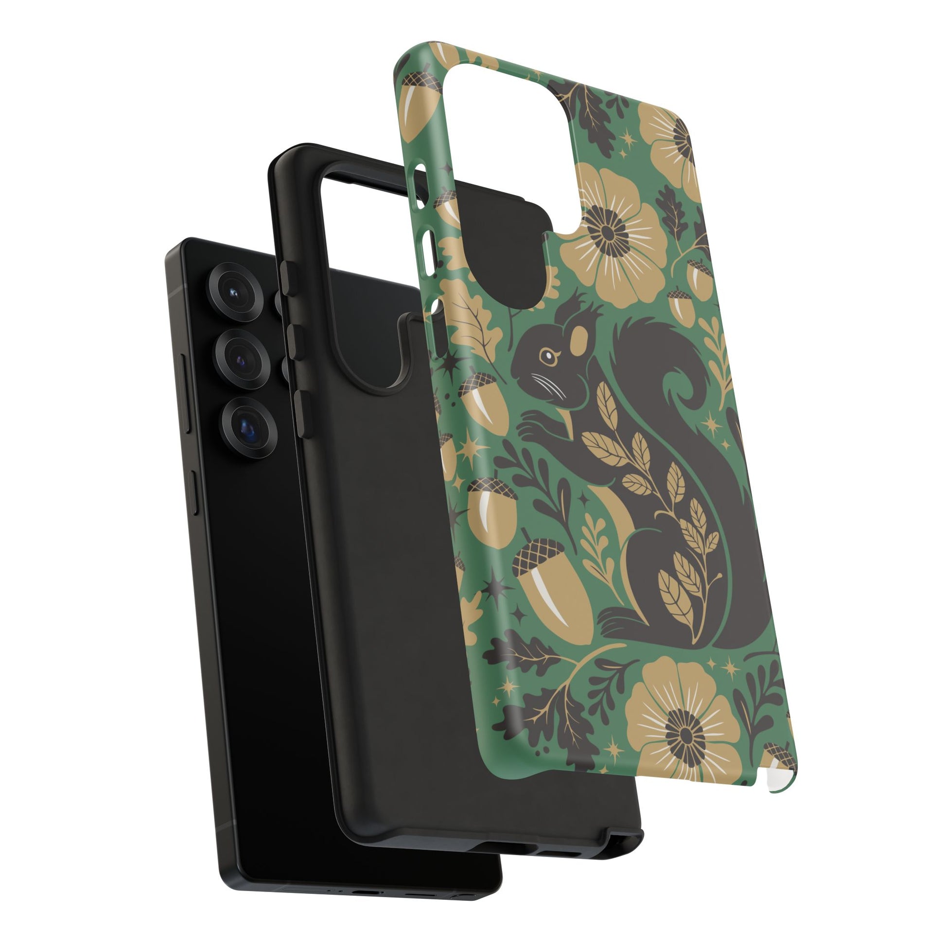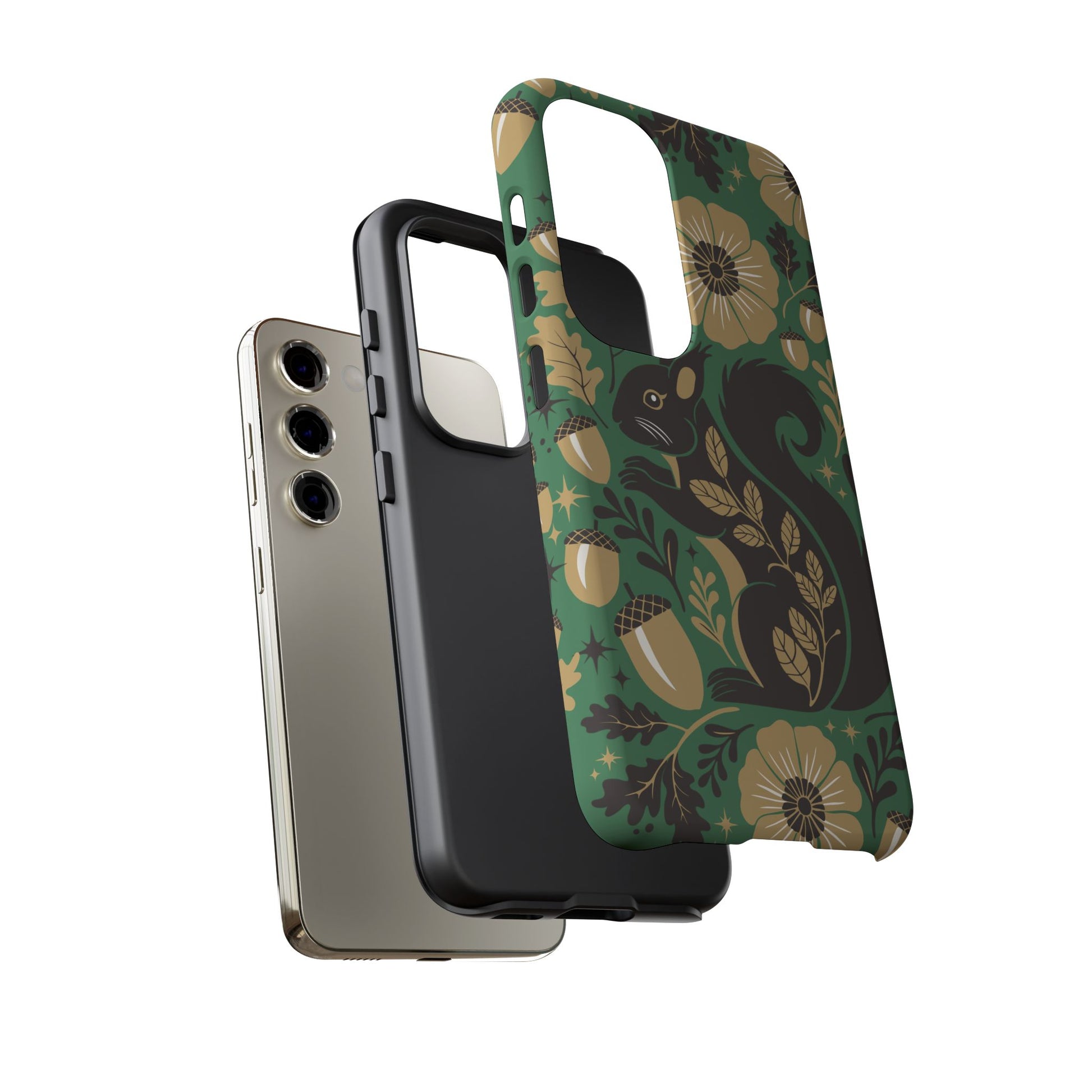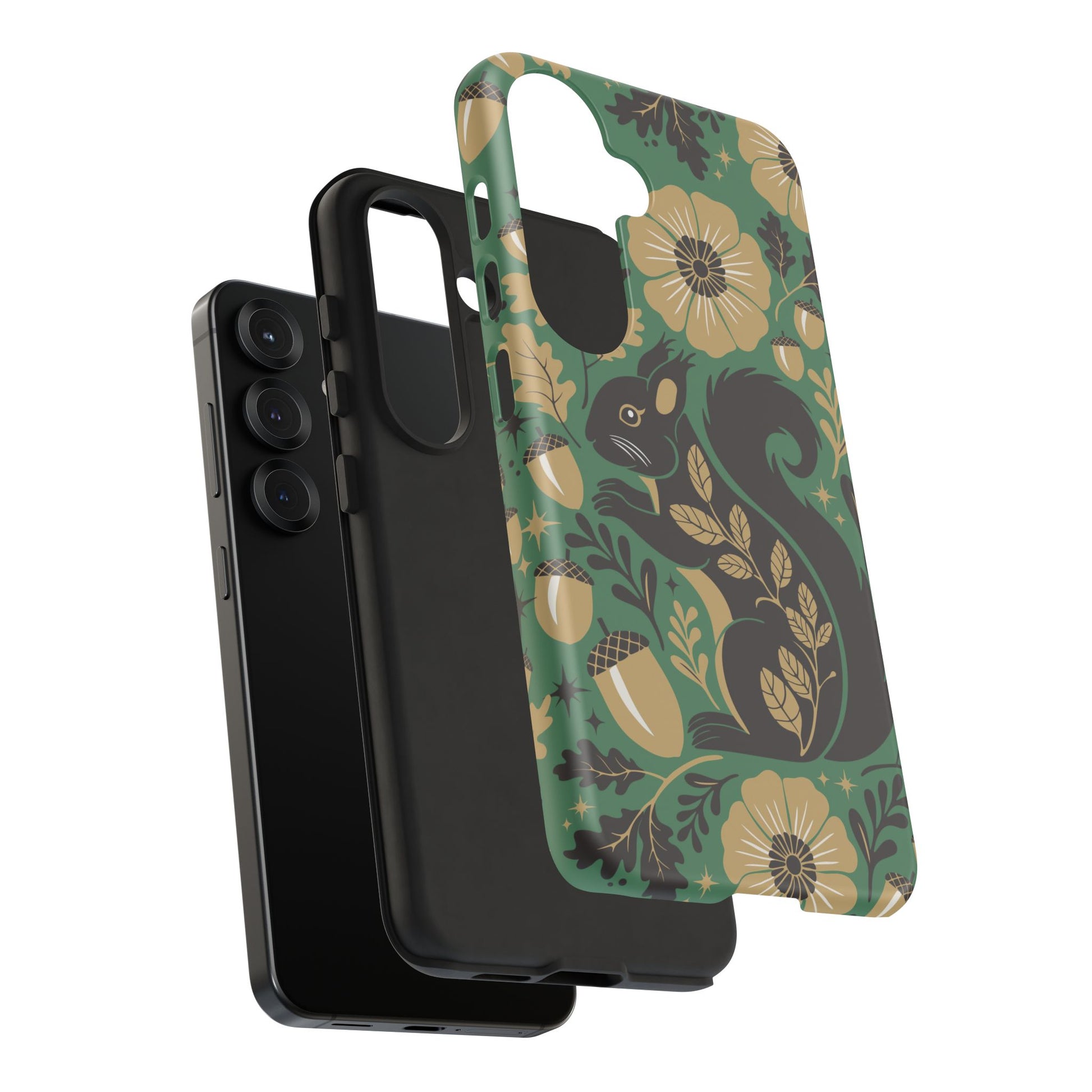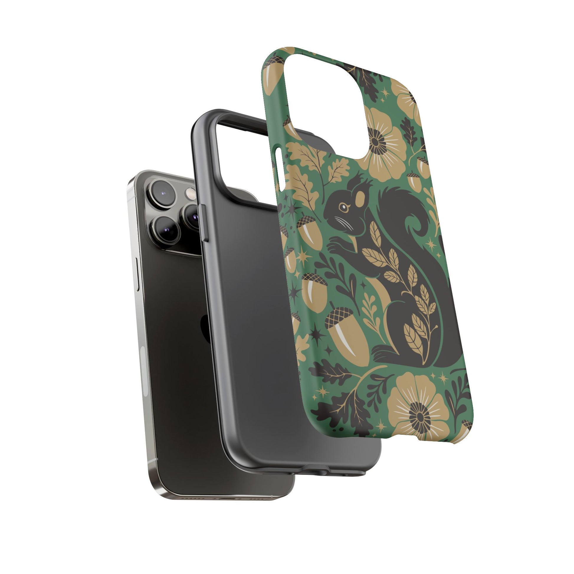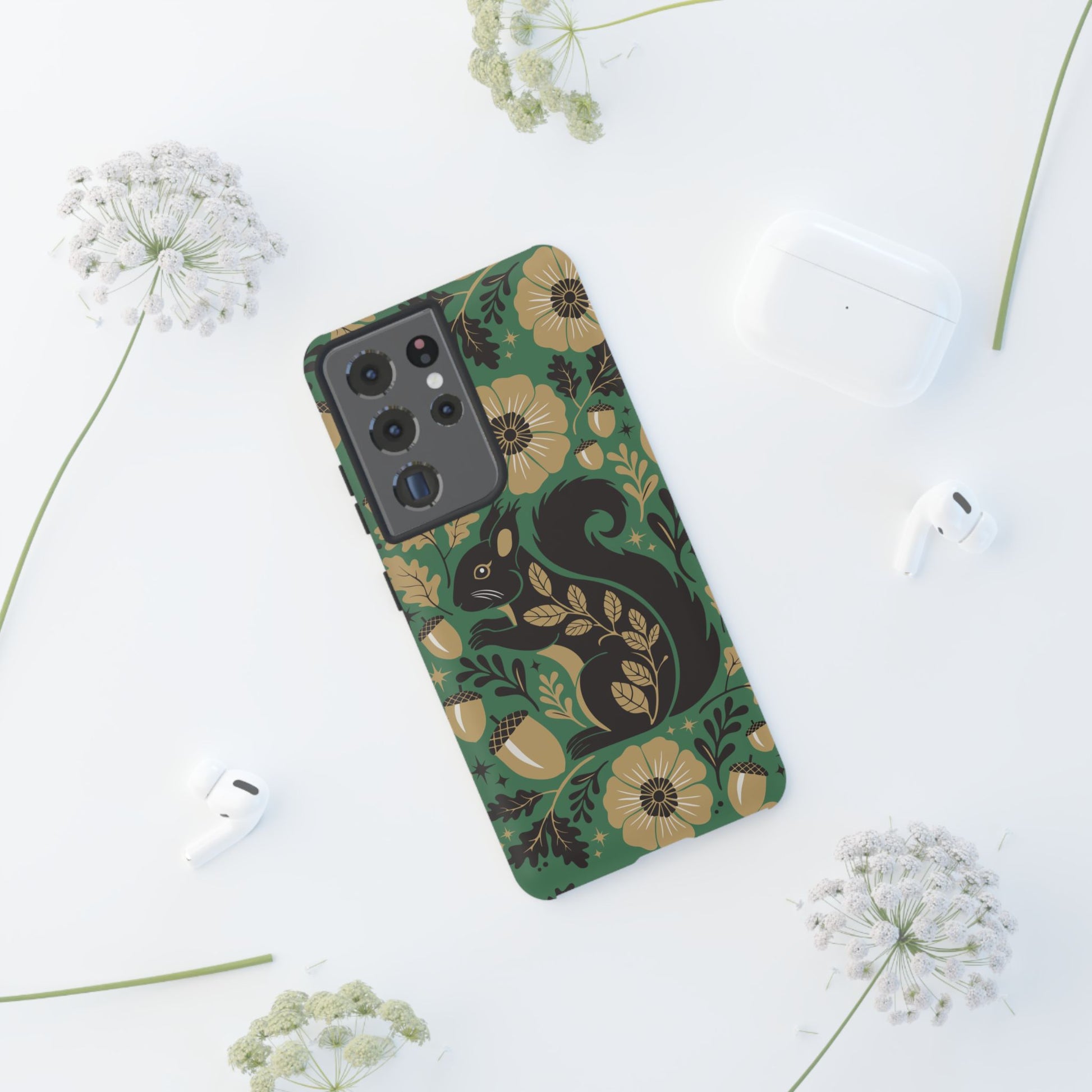 A slim, dual-layer protective phone case that pairs vintage squirrel folk-art charm with modern protection. The design features a hand-drawn black squirrel nestled among stylized floral blooms, leaves, and acorns on a deep matte green backdrop, with warm gold and cream accents that catch the eye. The matte finish keeps colors vivid while a soft TPU liner cushions against drops. This case slips easily into daily life, from commuting to coffee shop sketching, and keeps ports open for charging while supporting wireless charging. Weather-resistant coatings protect the print from UV and outdoor wear; follow simple care steps to keep the colors rich and the lining pristine. Multiple phone models available for Iphone, Samsung, and Google Pixel phones.