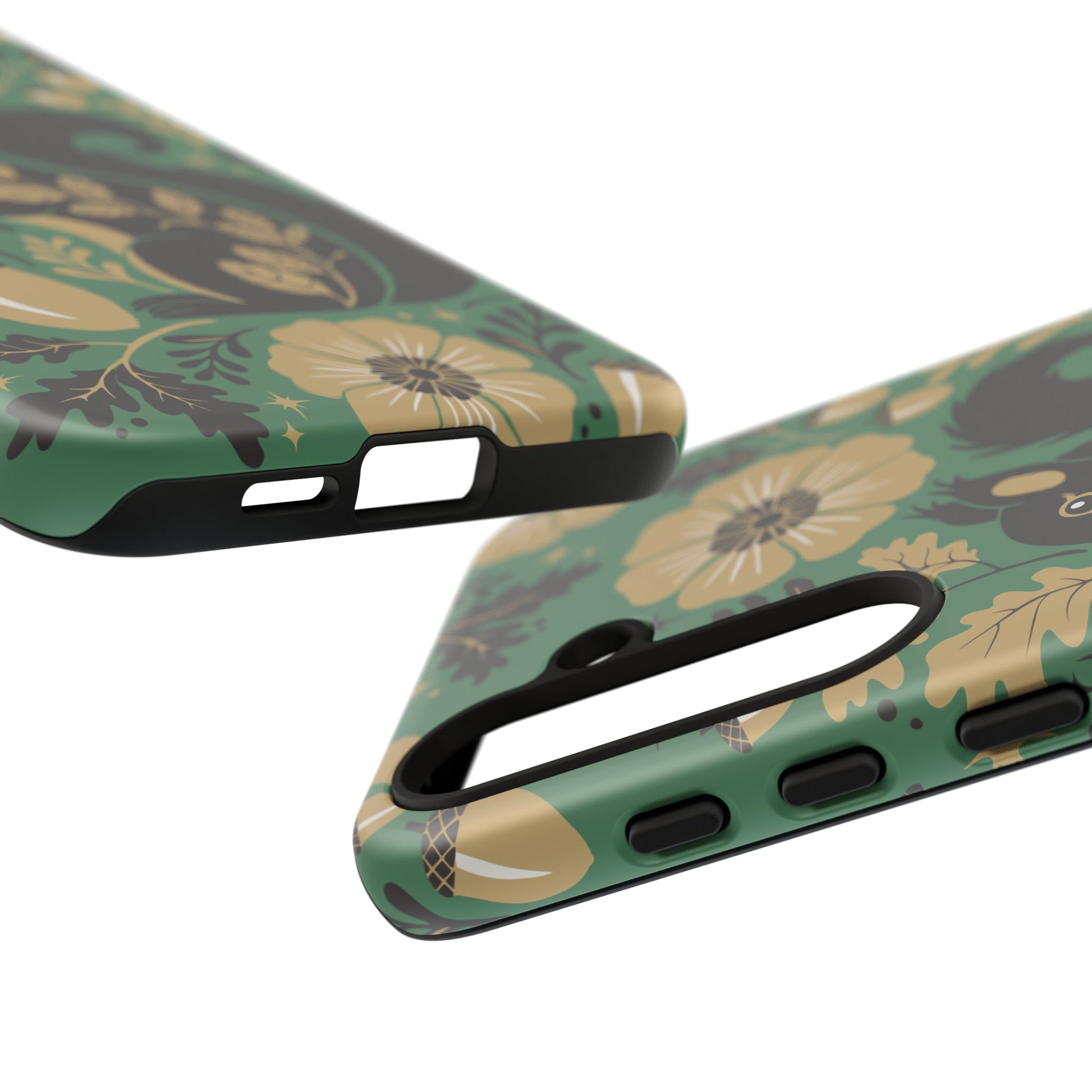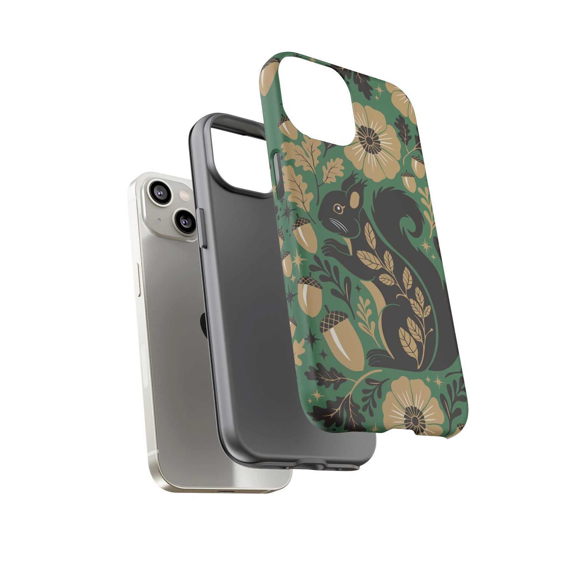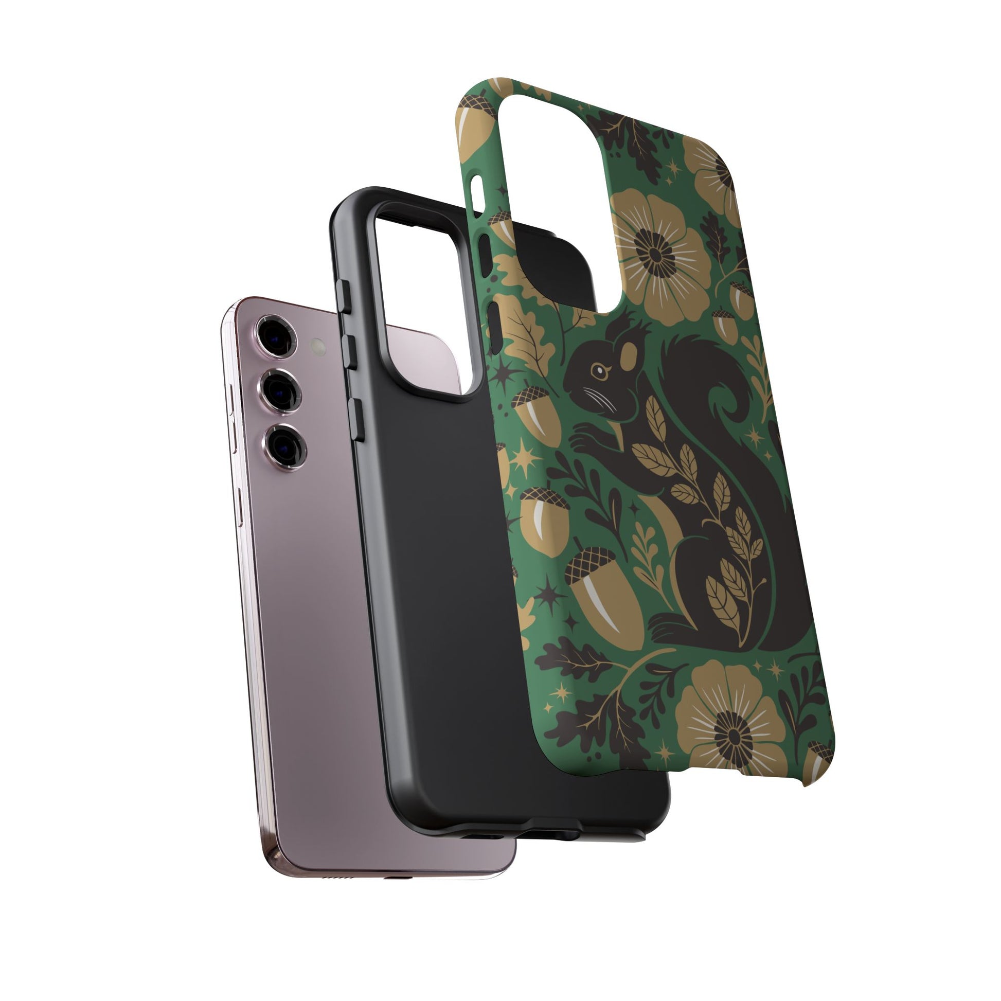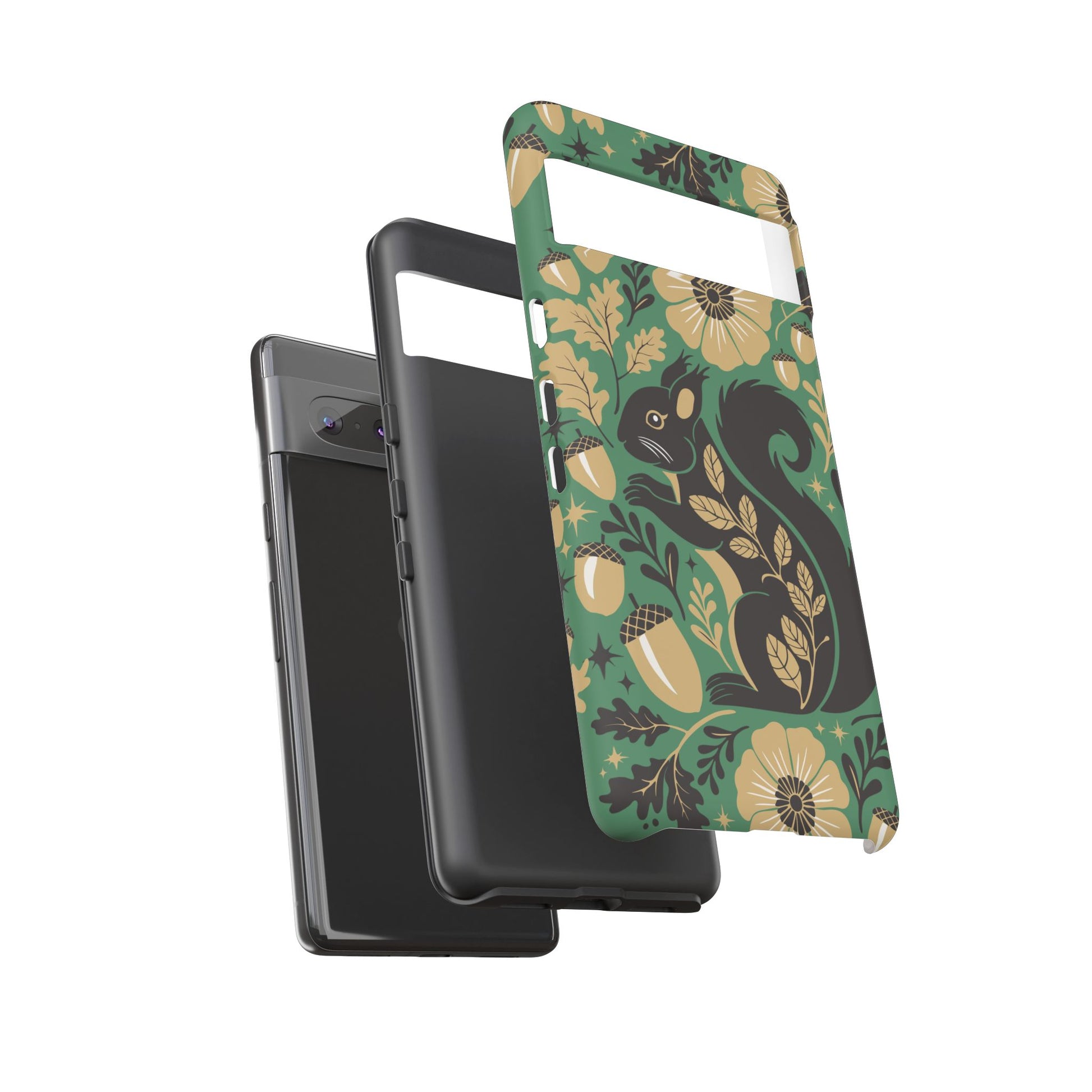 A slim, dual-layer protective phone case that pairs vintage squirrel folk-art charm with modern protection. The design features a hand-drawn black squirrel nestled among stylized floral blooms, leaves, and acorns on a deep matte green backdrop, with warm gold and cream accents that catch the eye. The matte finish keeps colors vivid while a soft TPU liner cushions against drops. This case slips easily into daily life, from commuting to coffee shop sketching, and keeps ports open for charging while supporting wireless charging. Weather-resistant coatings protect the print from UV and outdoor wear; follow simple care steps to keep the colors rich and the lining pristine. Multiple phone models available for Iphone, Samsung, and Google Pixel phones.
