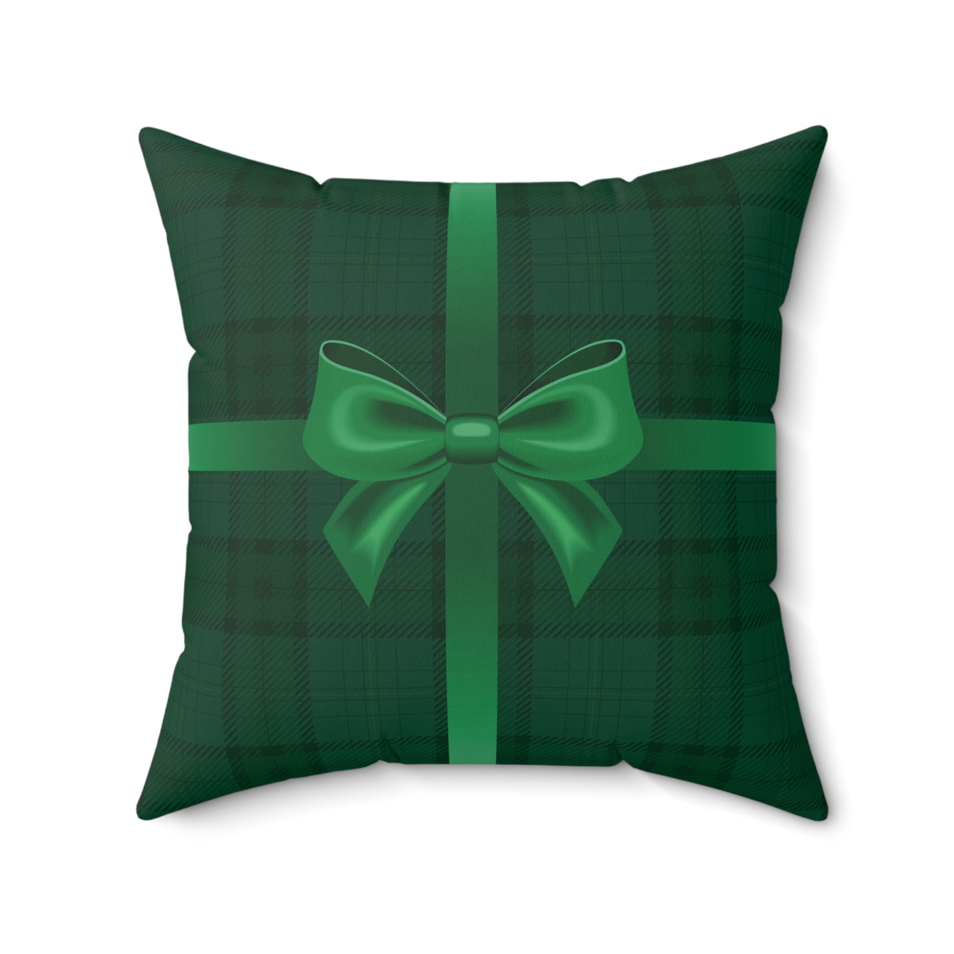 A cozy, festive pillow with a design of a cheery wrapped Christmas gift that brings the warmth of holiday tradition into any room. The green tartan background feels like a well-worn wool blanket, while the satin green ribbon and bow read like a carefully wrapped present on the mantel. It sits quietly on a couch or armchair and instantly makes a space feel curated and ready for guests — the kind of detail that sparks conversation and small, slow moments: opening stockings, steaming cocoa, soft music in the background. Durable spun polyester keeps the colors vivid and the shape held, while the plump recycled insert gives it a full, comforting silhouette. Use it to layer on a sofa with knit throws, tuck it into a reading nook, or set it on a window seat to catch winter light and bring a touch of classic holiday charm.