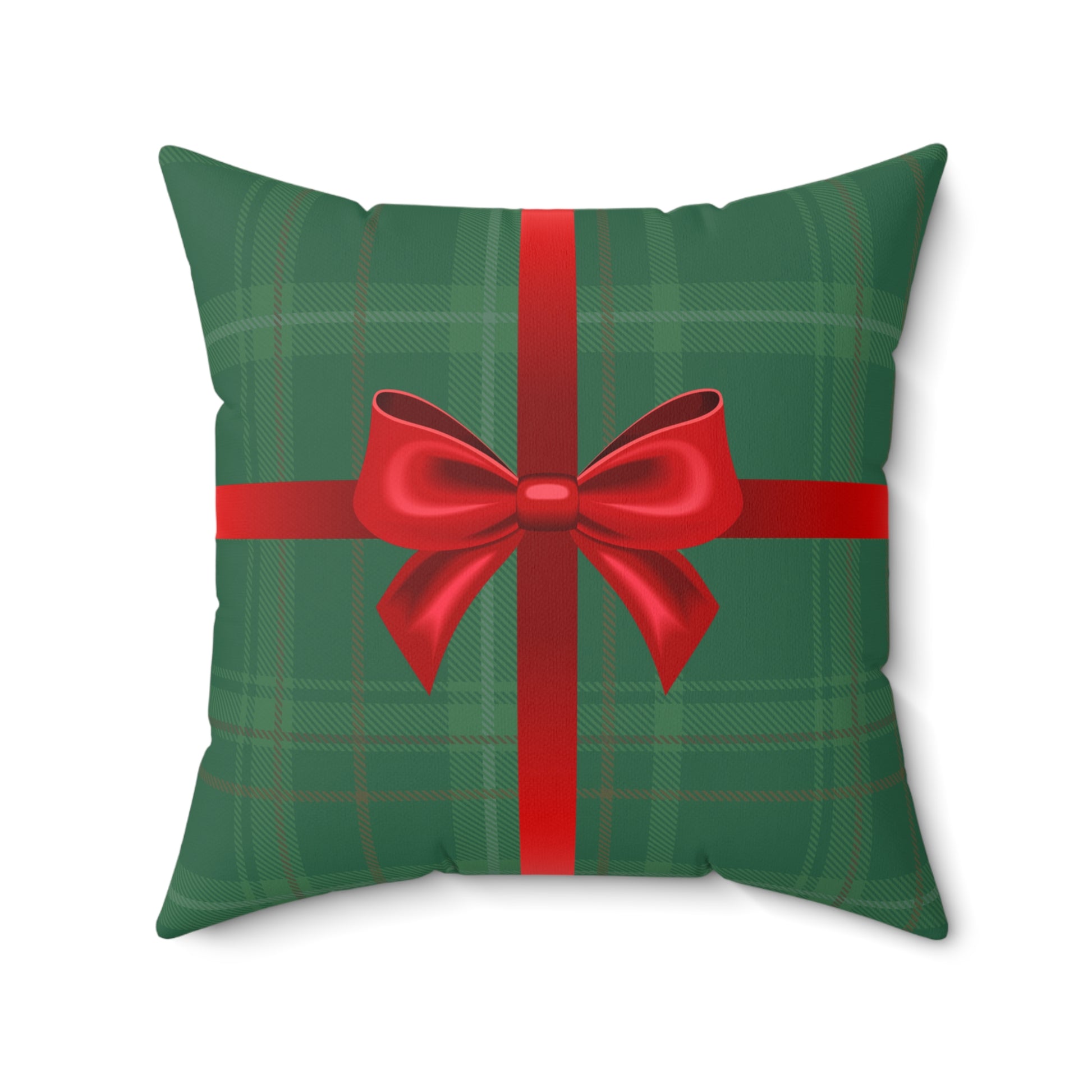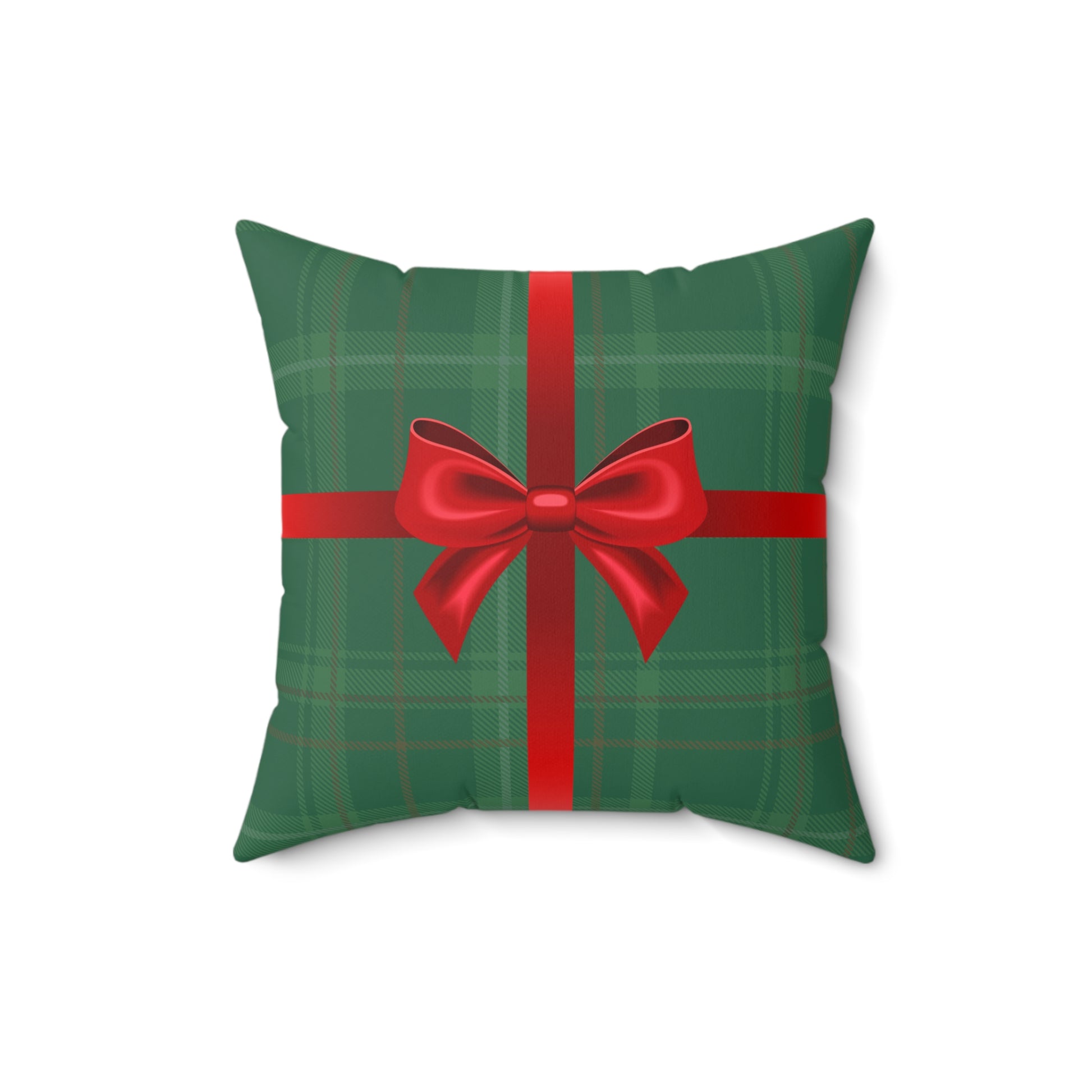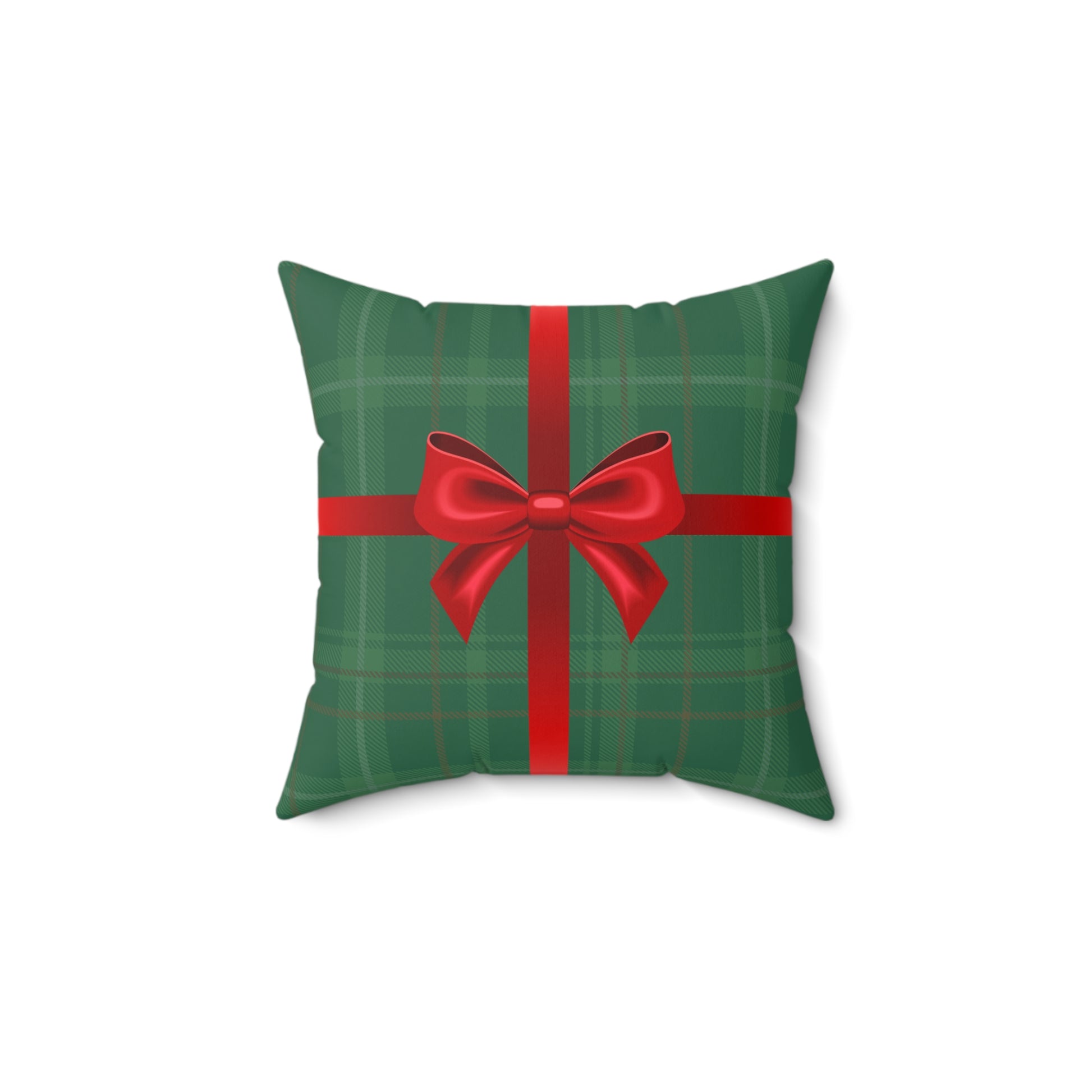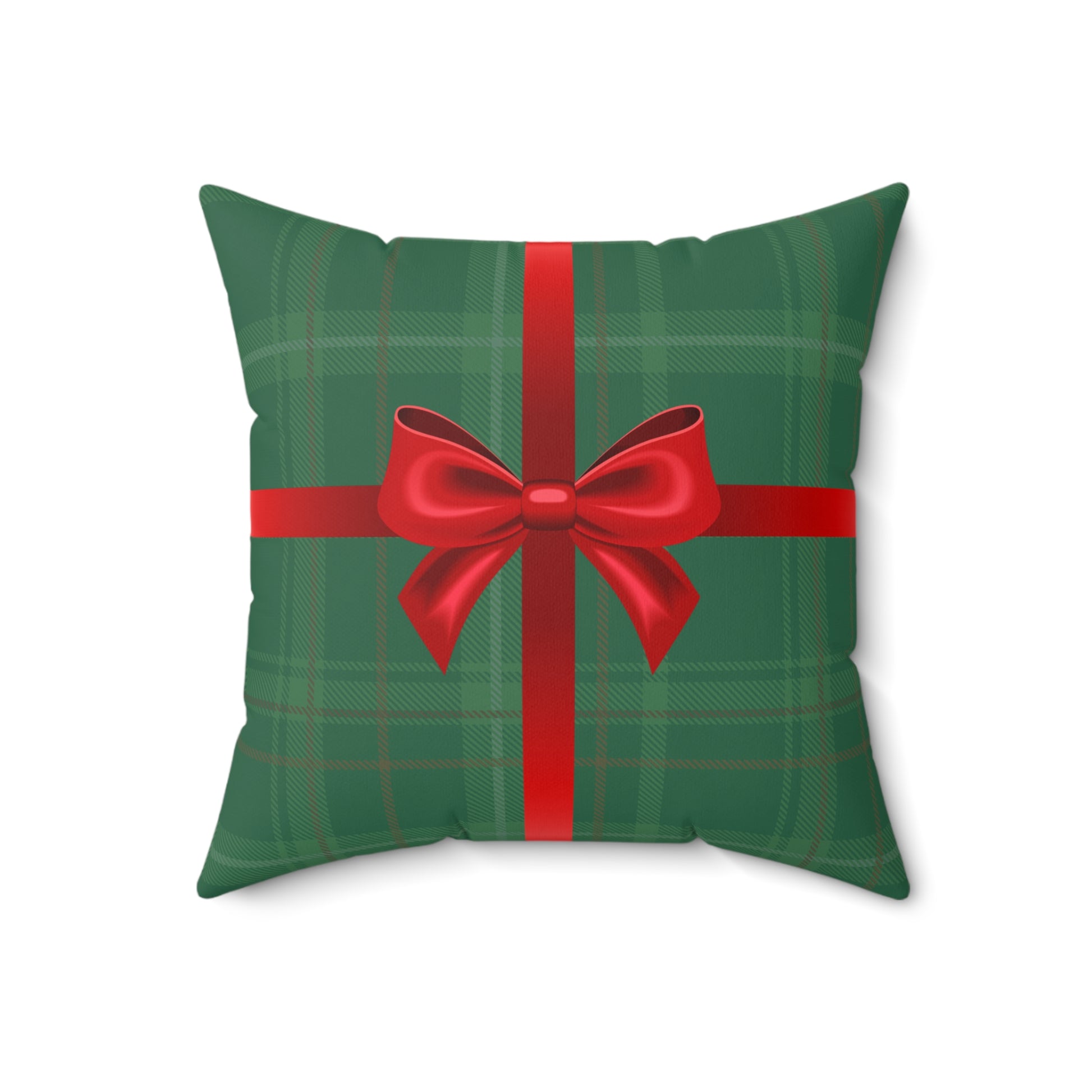 A cozy, festive pillow with a design of a cheery wrapped Christmas gift that brings the warmth of holiday tradition into any room. The green tartan background feels like a well-worn wool blanket, while the satin-red ribbon and bow read like a carefully wrapped present on the mantel. It sits quietly on a couch or armchair and instantly makes a space feel curated and ready for guests — the kind of detail that sparks conversation and small, slow moments: opening stockings, steaming cocoa, soft music in the background. Durable spun polyester keeps the colors vivid and the shape held, while the plump recycled insert gives it a full, comforting silhouette. Use it to layer on a sofa with knit throws, tuck it into a reading nook, or set it on a window seat to catch winter light and bring a touch of classic holiday charm.