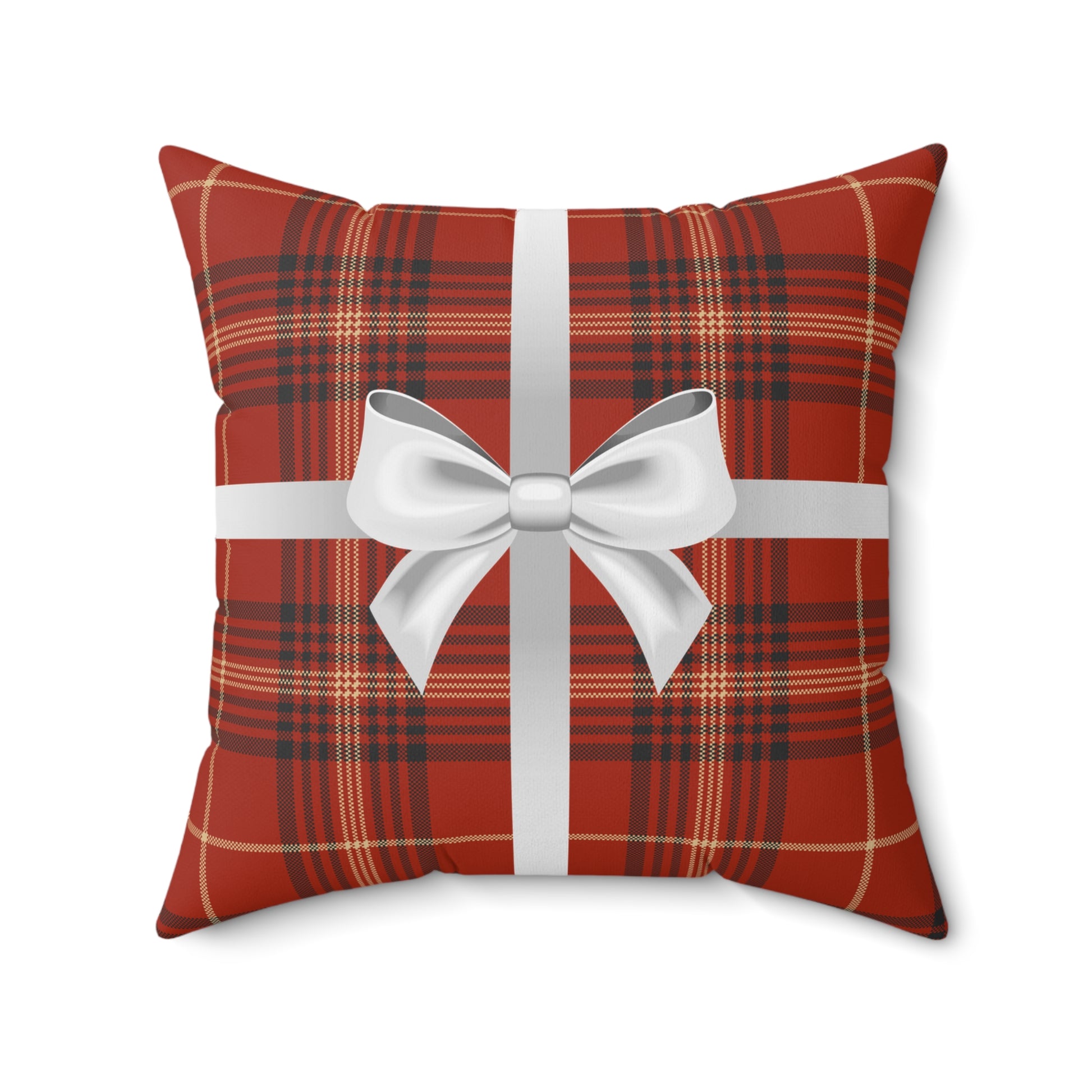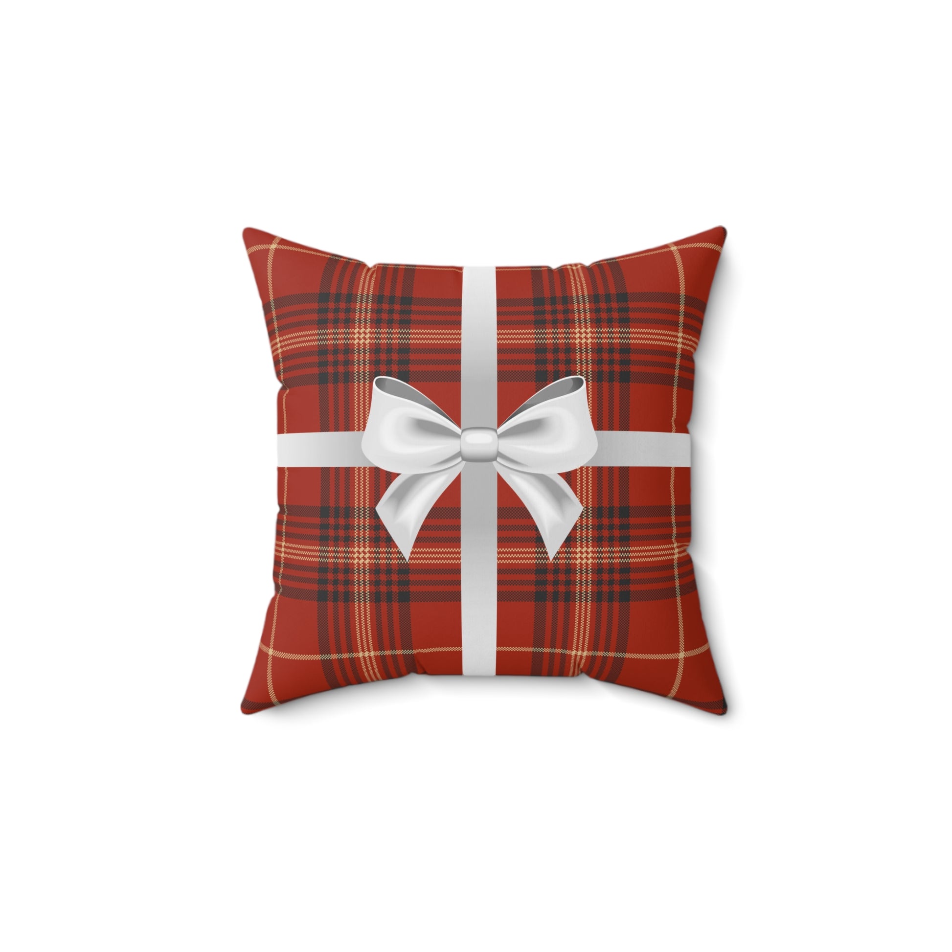 A cozy, festive pillow with a design of a cheery wrapped Christmas gift that brings the warmth of holiday tradition into any room. The red tartan background feels like a well-worn wool blanket, while the satin ribbon and bow read like a carefully wrapped present on the mantel. It sits quietly on a couch or armchair and instantly makes a space feel curated and ready for guests — the kind of detail that sparks conversation and small, slow moments: opening stockings, steaming cocoa, soft music in the background. Durable spun polyester keeps the colors vivid and the shape held, while the plump recycled insert gives it a full, comforting silhouette. Use it to layer on a sofa with knit throws, tuck it into a reading nook, or set it on a window seat to catch winter light and bring a touch of classic holiday charm.