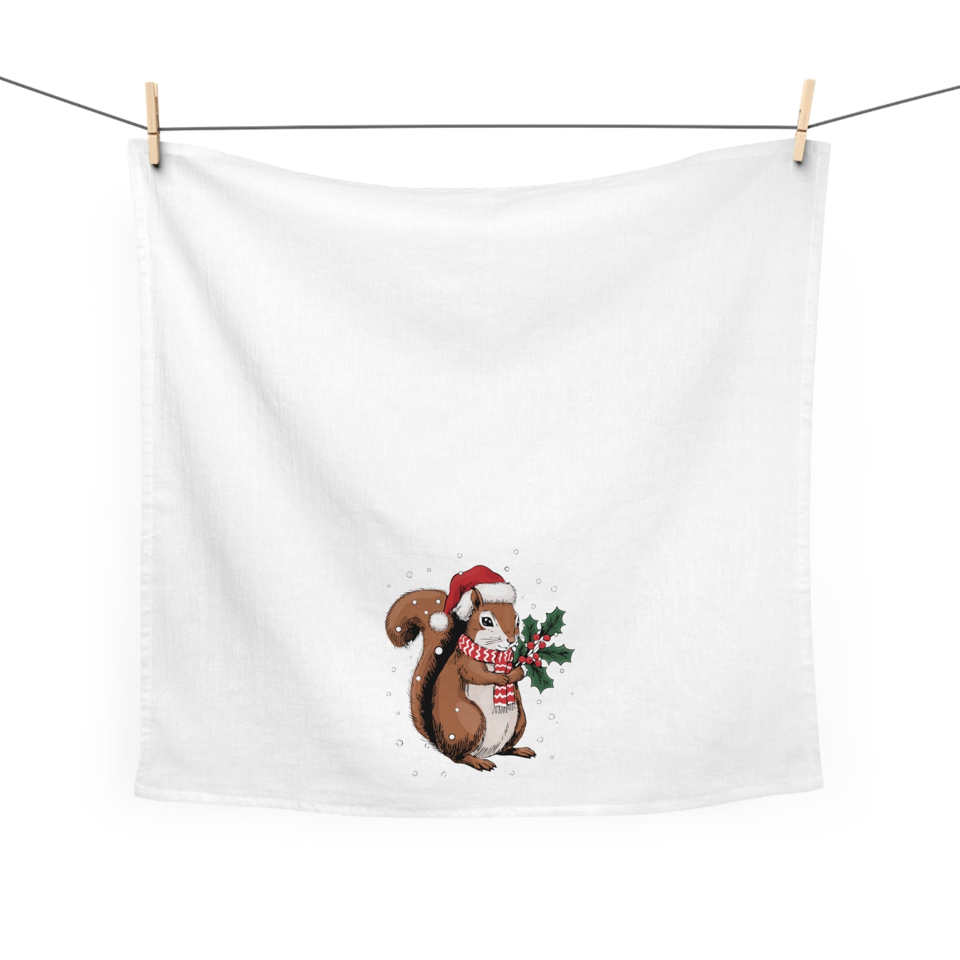 Elevate your kitchen game with this charming Holiday Squirrels tea towel, adorned with an adorable festive squirrel in a Santa hat. Perfect for anyone who loves to cook or bake during the Christmas season, this towel adds a warm, festive, and whimsical touch to your holiday home decor. Made with 100% cotton, it is not only soft to the touch but also highly absorbent and quick-drying, making it a practical choice for everyday use. Its fun Christmas squirrels design lends a cozy atmosphere to your kitchen, making it ideal for holiday gatherings, family dinners, or casual brunches. This tea towel is a delightful gift for chefs, bakers, or anyone who enjoys a bit of seasonal cheer in their home. Celebrate the holidays with this lovely addition that brings warmth, cuteness, and functionality to your kitchen decor.