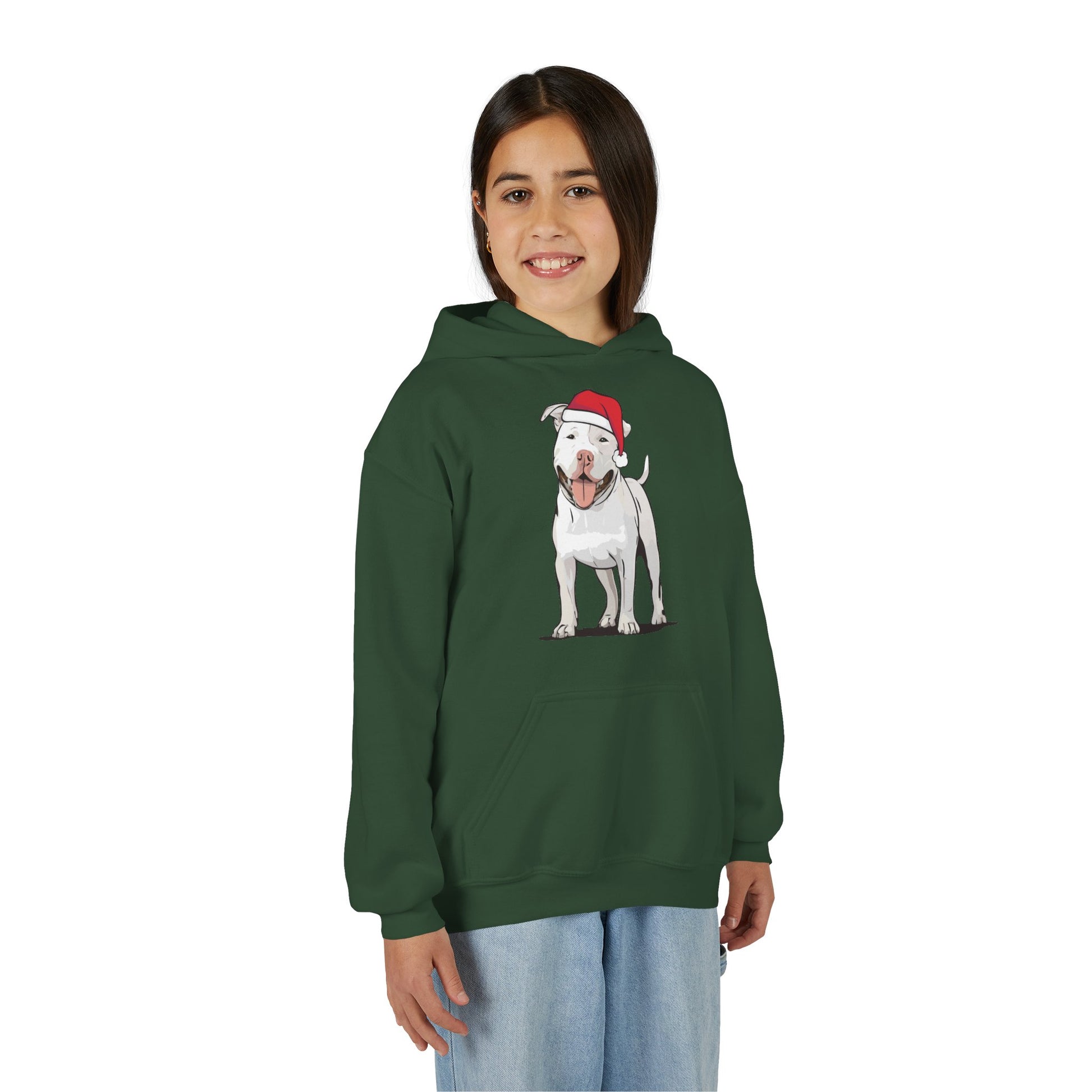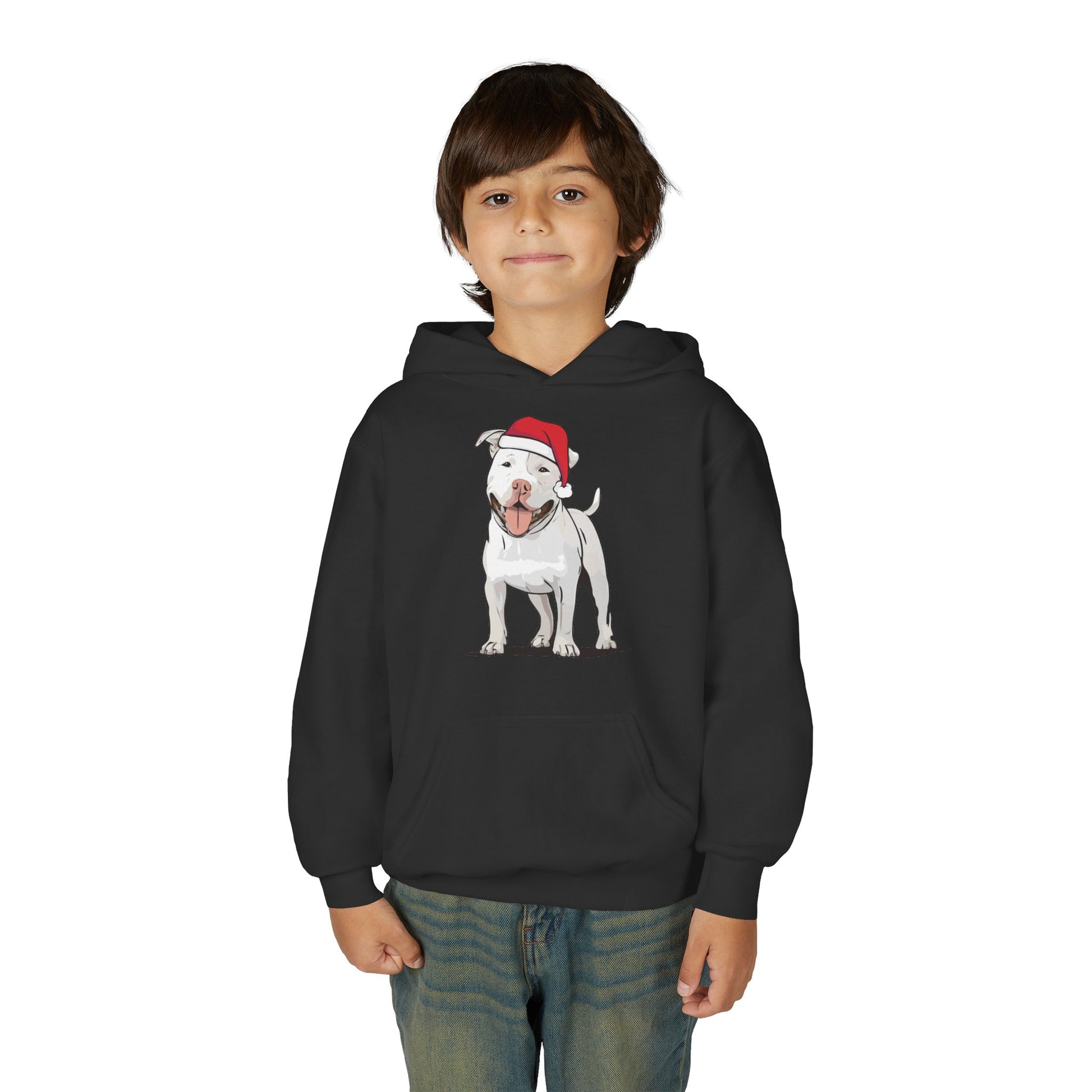 A festive Christmas kids pullover hoodie featuring a white American Pit Bull Terrier Puppy Dog dressed in a Santa hat. Perfect for adding a touch of holiday spirit and cheer to your child's winter wardrobe. Cozy hooded sweatshirt with unisex fit for both boys and girls. Ideal for those who love Christmas and cute animal designs.