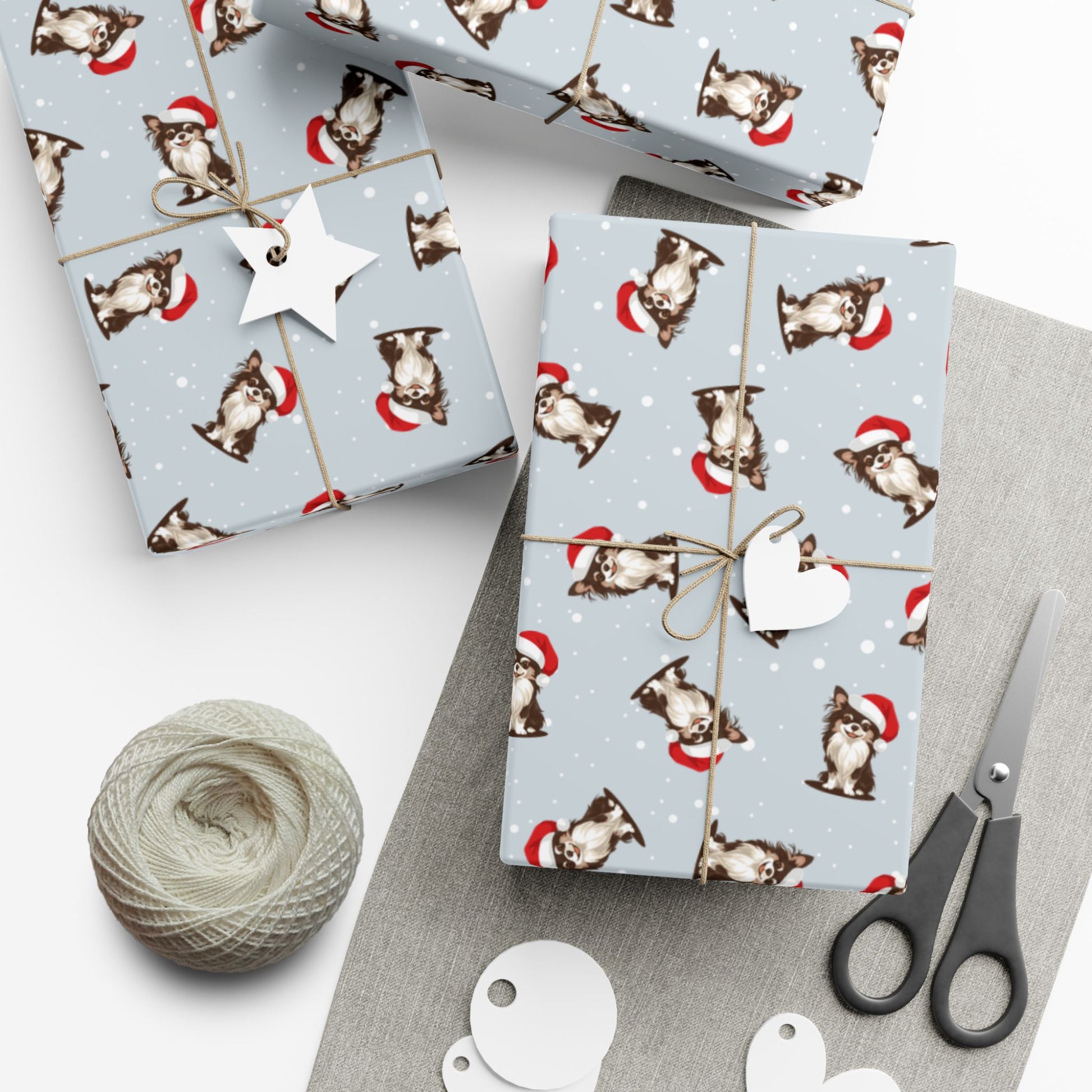 Long Haired Chihuahua Dog Christmas Wrapping Paper, Dogs Print, Cheery Holiday Gift Wrap With Snowy Xmas Puppy In Santa Hat