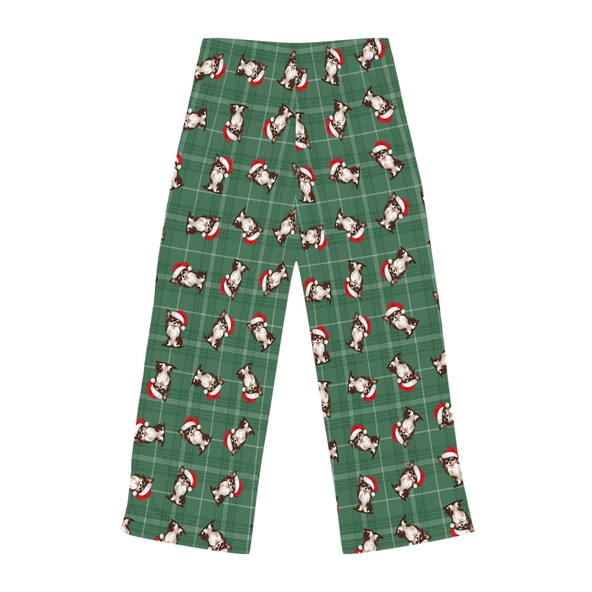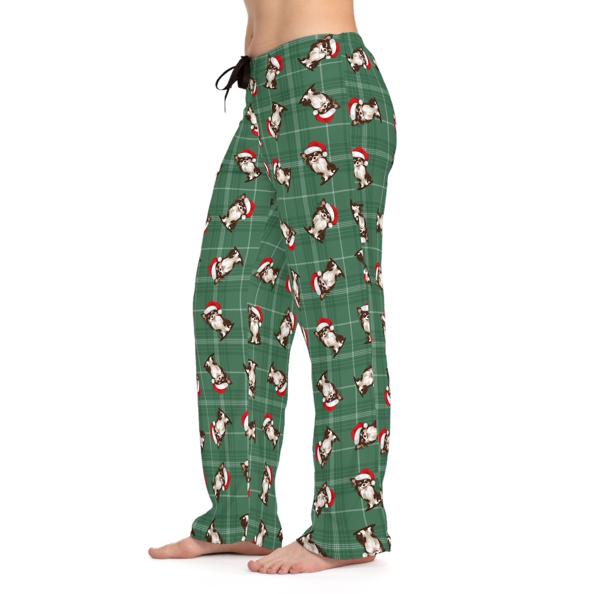 Long Haired Chihuahua Dog Womens Christmas Pajama Pants, Santa Chihuahuas Dogs Green Plaid PJ Bottoms Winter Loungewear, Holiday Sleepwear