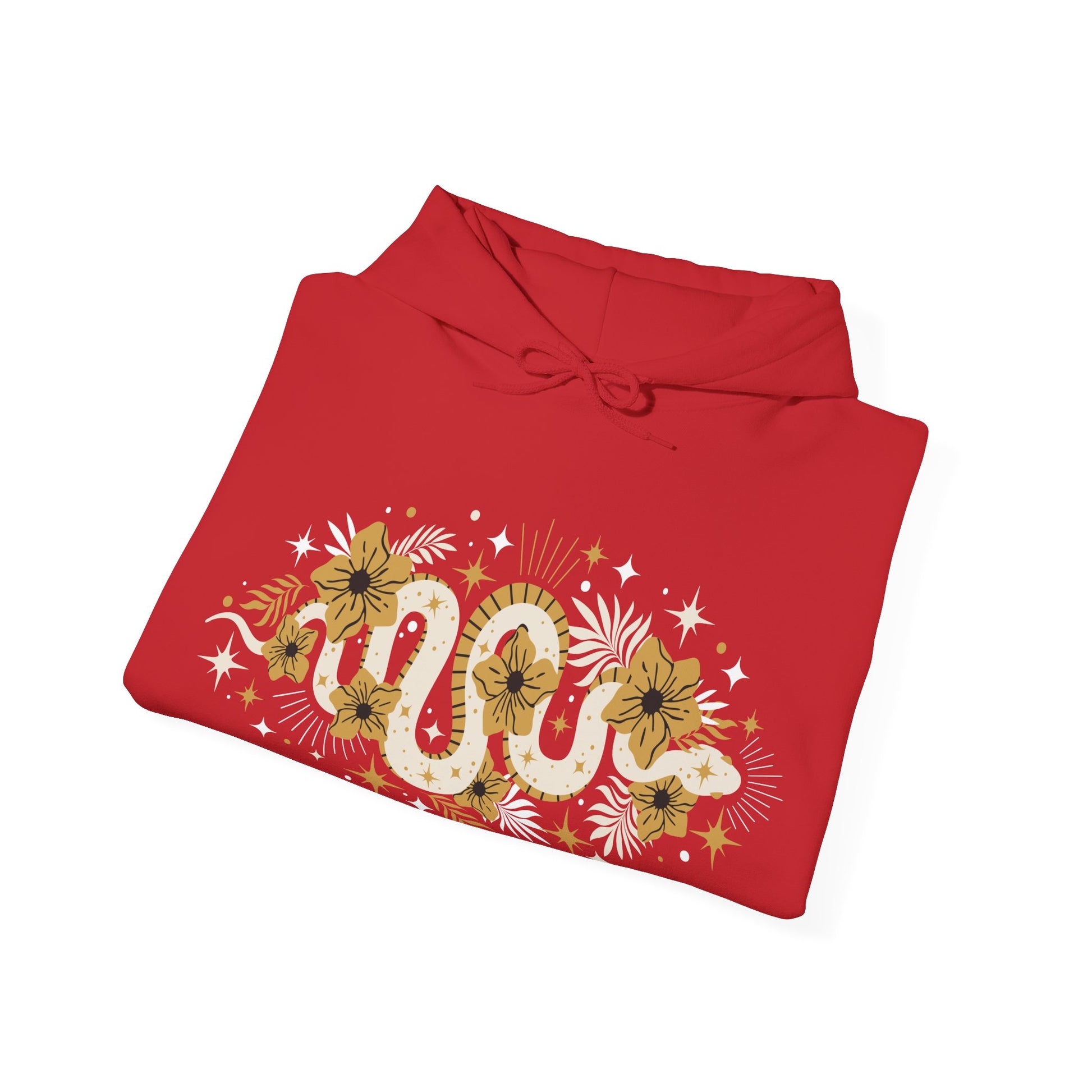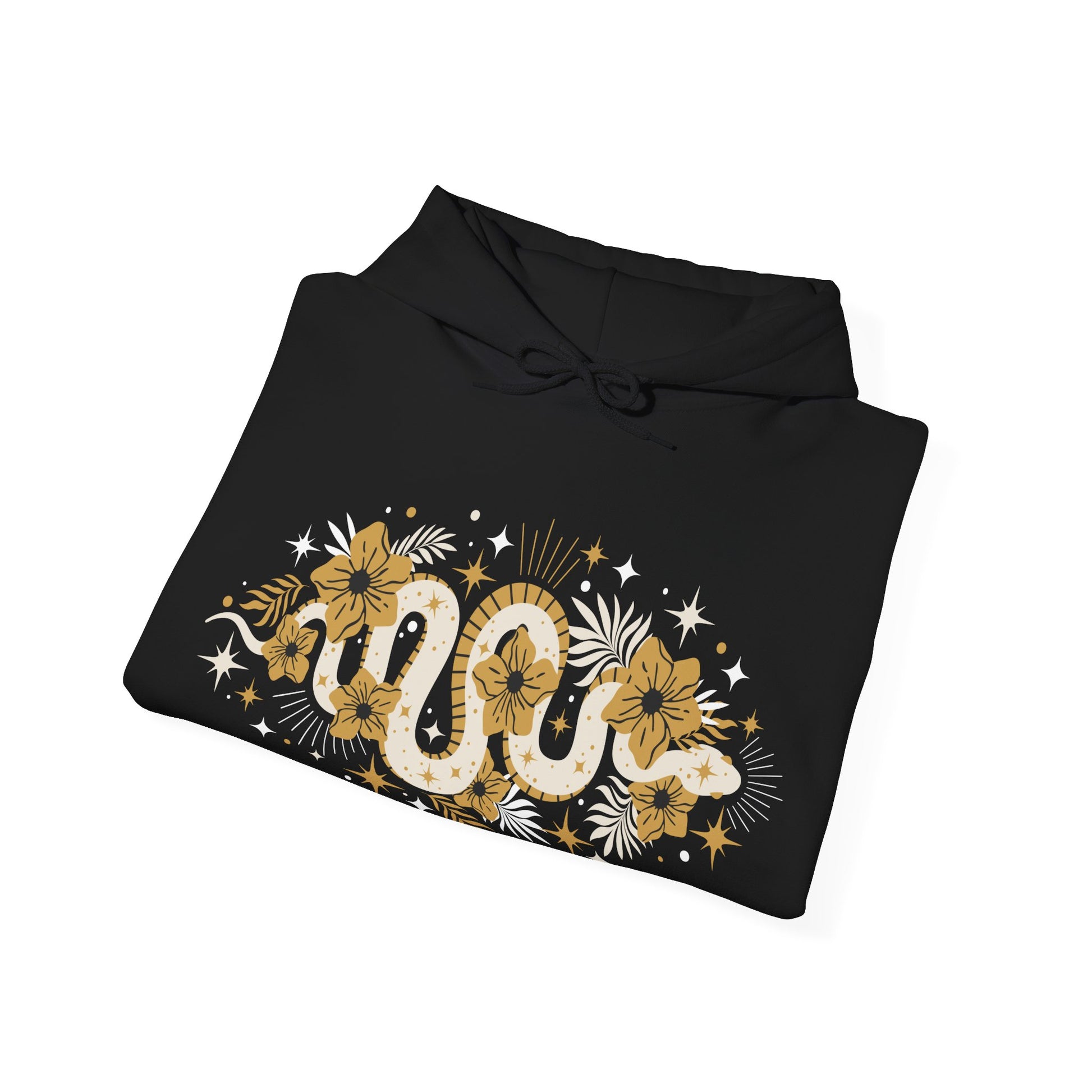 Mystic Gold Snake & Flower Unisex Hoodie, Boho Pullover Hooded Sweatshirt, Bohemian Witchy Snake Print Hoodies