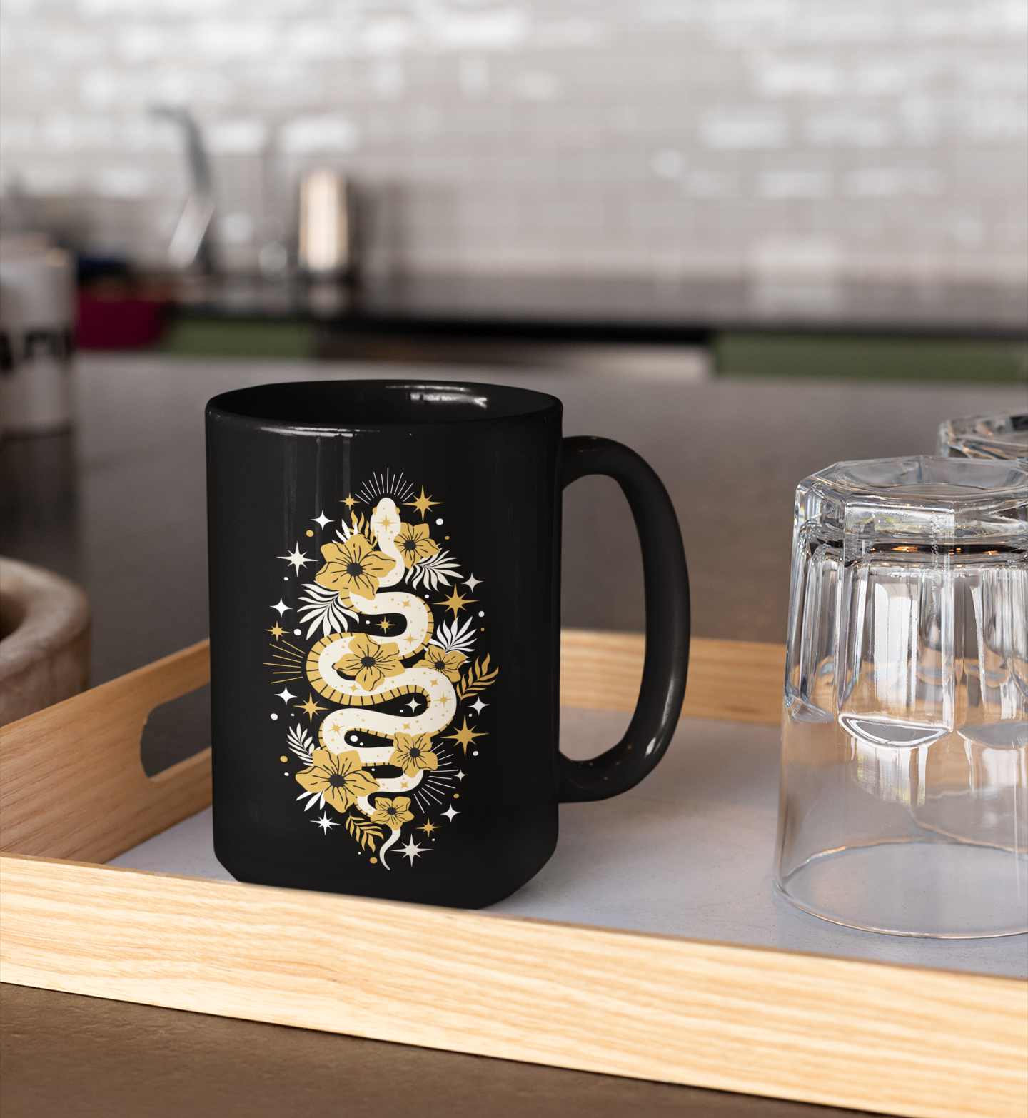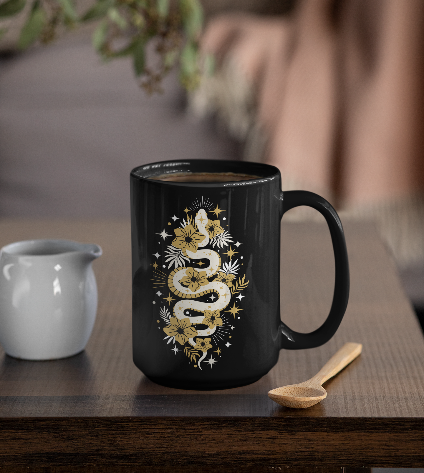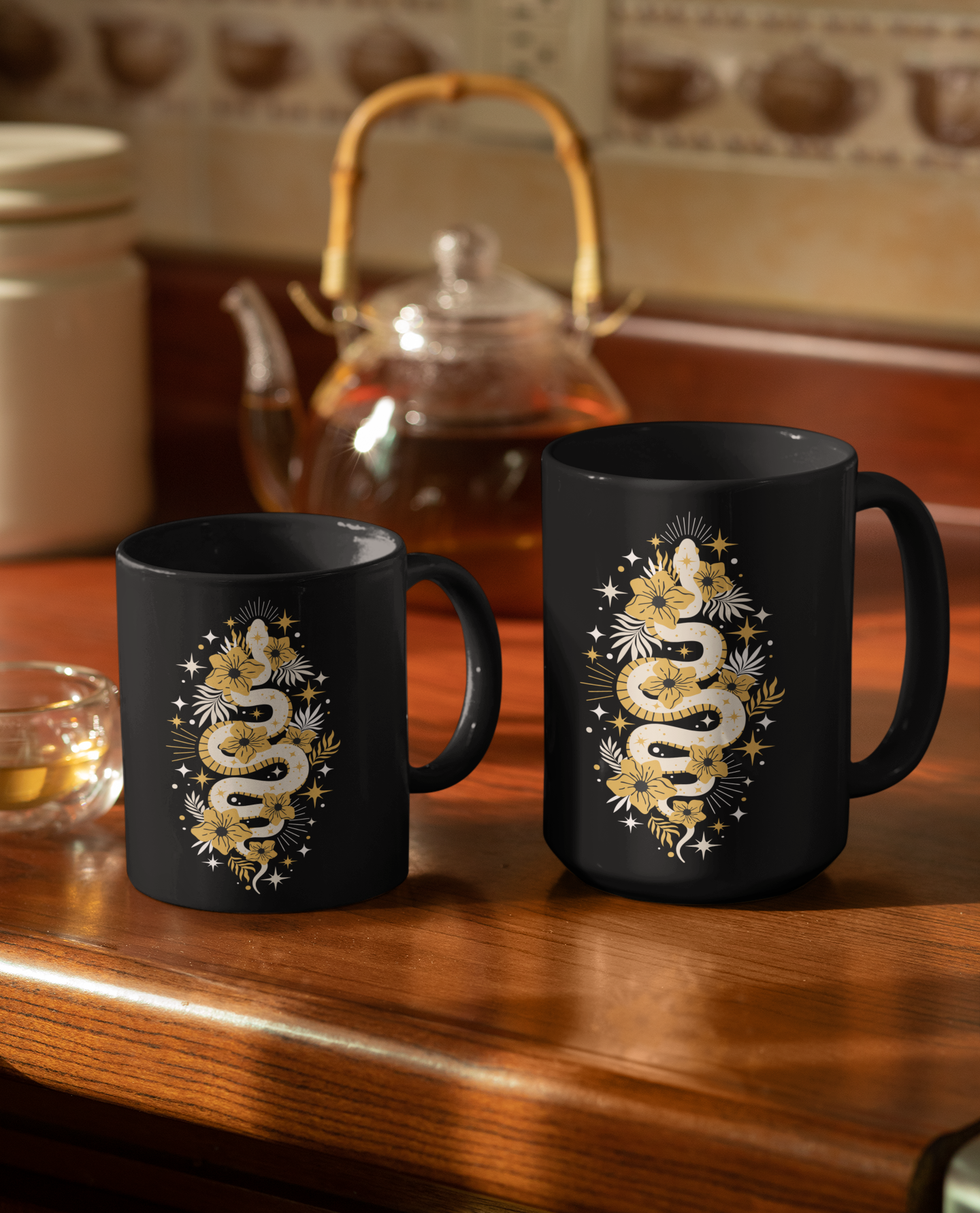 Mystic Golden Snake Black Mug, Boho Ceramic Coffee Cup, Unique Serpent Design, Coffee Mugs 11oz or 15oz Size