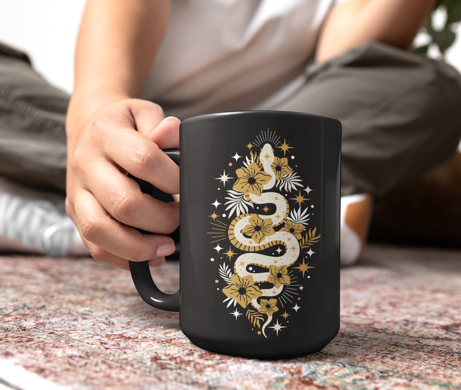 11oz or 15oz black ceramic coffee mug with mystic boho snake design, perfect for those who love bohemian and mystical vibes. This mug is ideal for coffee lovers, tea enthusiasts, and anyone who appreciates unique and artistic designs. Great for gifting during birthdays, holidays, or as a special treat for yourself. Product features - Glossy ceramic finish - Vibrant colors - Microwave and dishwasher safe - Two sizes available (11oz and 15oz) - Lead and BPA-free Care instructions - Clean in dishwasher or wash by hand with warm water and dish soap