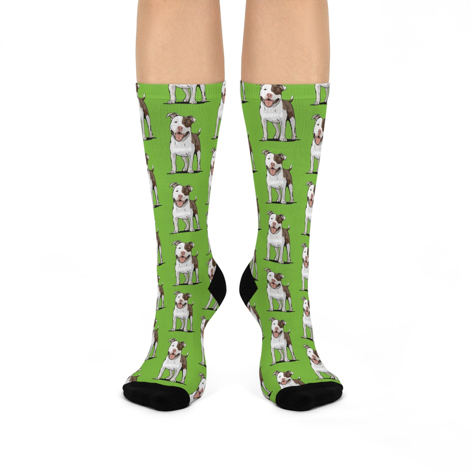 Pitbull Dog Green Cushioned Crew Socks, Cute Pit Bull Terrier Dogs Pet Pattern Novelty Socks, Mens Womens Unisex Socks One Size