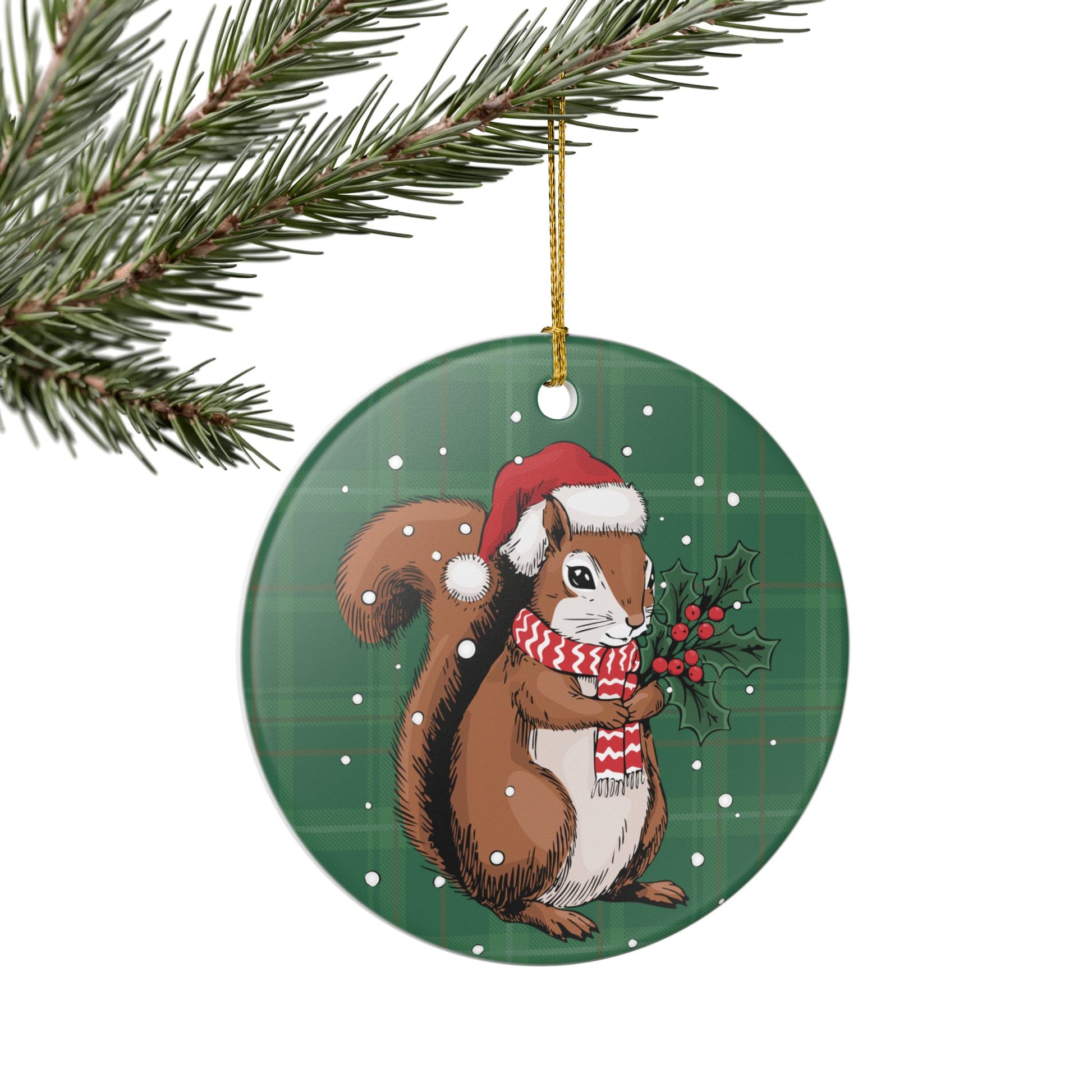 Introduce a touch of charm to your holiday decor with this delightful Santa Squirrel ceramic Christmas tree ornament. This beautiful piece features a glossy finish and a sweet cozy squirrels design that captures the essence of the festive spirit. Perfect for adorning your Christmas tree, this ornament brings warmth and joy to your holiday home decorations, making your celebrations even more memorable. The golden string adds an elegant touch, allowing it to hang beautifully on your Christmas tree. This green plaid squirrel ornament is ideal for animal lovers and those looking to add a personal touch to their holiday decor. It's also a wonderful gift for family and friends during the holiday season, birthdays, or just to show you care. Celebrate the joy of togetherness with this lovely ceramic ornament, perfect for creating treasured memories every year.