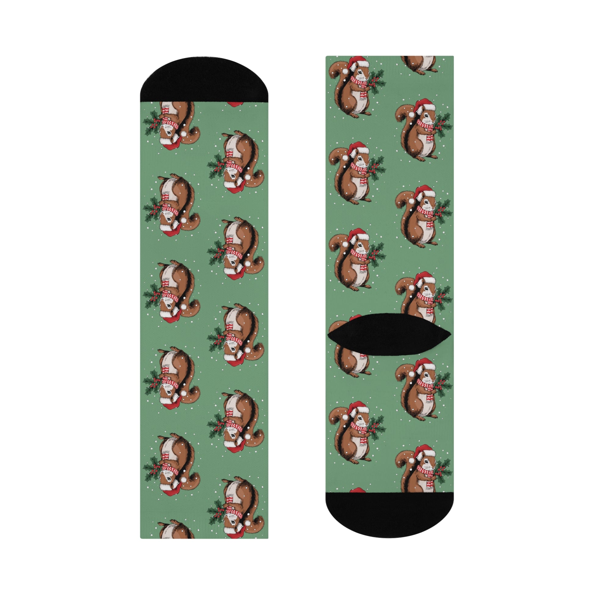 Step into comfort and style with these vibrant Santa Squirrel crew socks, designed to elevate your winter wardrobe. The cheery all-over Christmas Squirrels print radiates a fun and festive vibe, making them a perfect addition to your holiday outfits. Whether you're cozying up at home or showcasing your unique style out on the town or at a Christmas party, these socks are a delightful way to express your personality and celebrate the holiday season. Ideal for anyone looking to add a touch of cute animal whimsy to their outfit, they're especially great for gifting during the holiday season, family gatherings, and celebrations. With a comfortable fit spanning women's size 5 to men's size 12, these socks are suitable for a wide audience and are sure to put a smile on anyone’s face!