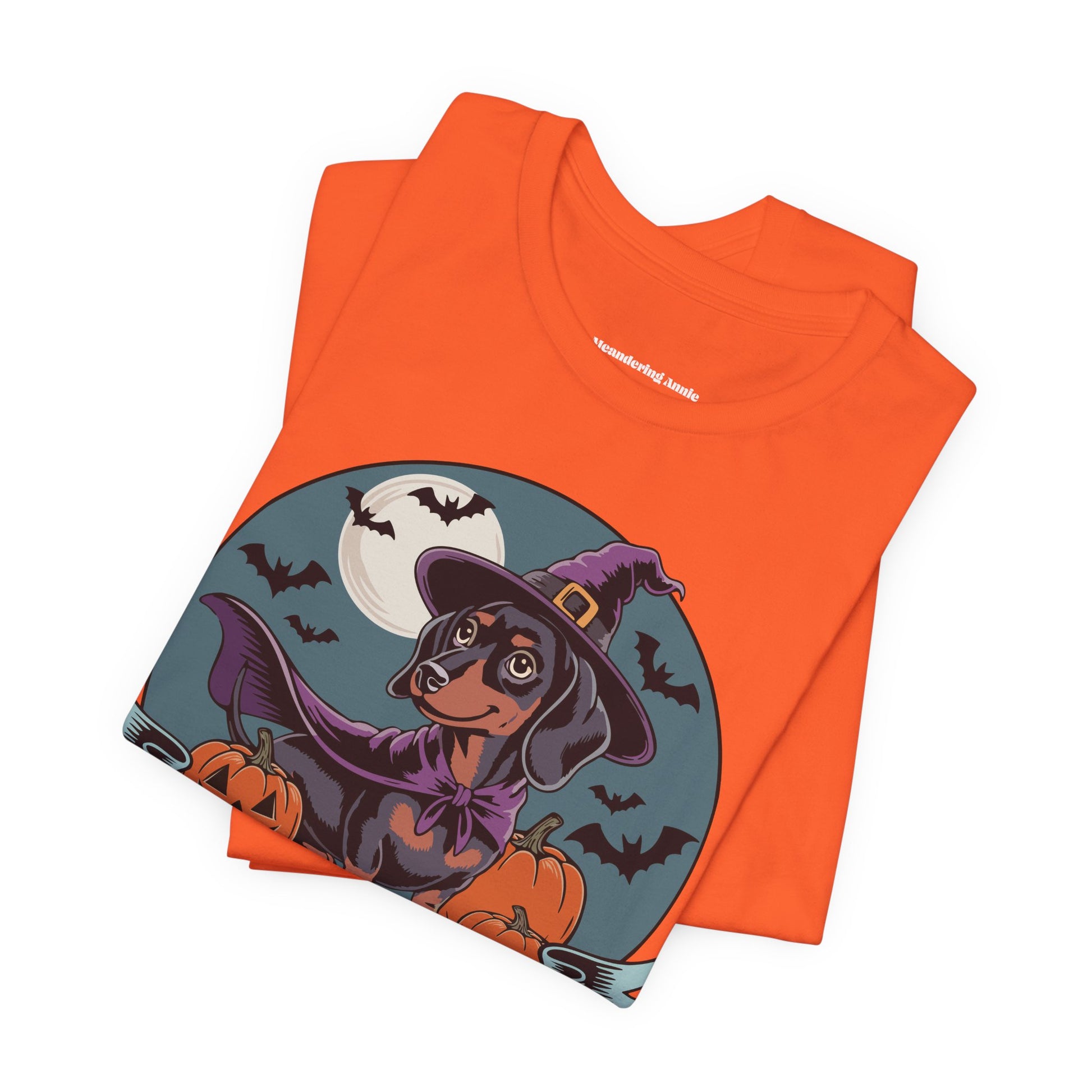 Spooky Dachshund Halloween T-shirt, Happy Halloweenie Unisex Tee, Witchy Weiner Long Dog, Pumpkins Bats, Fall Holiday Shirts