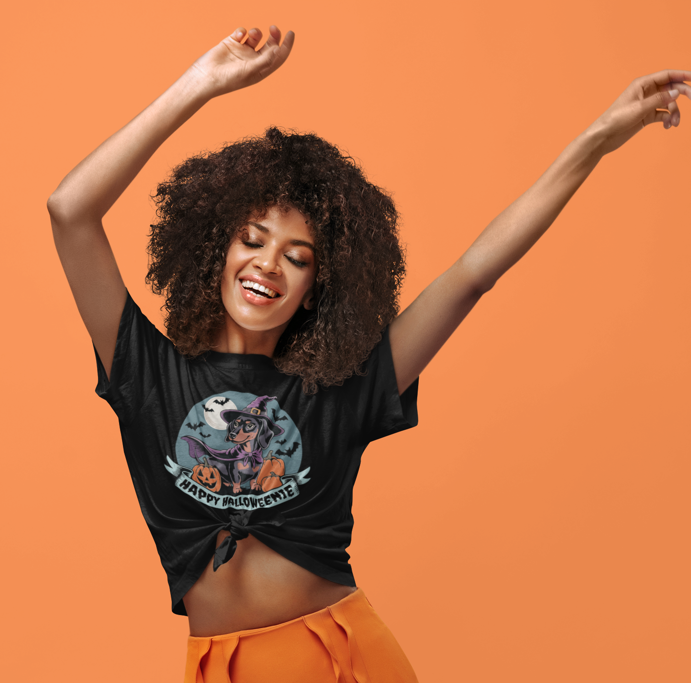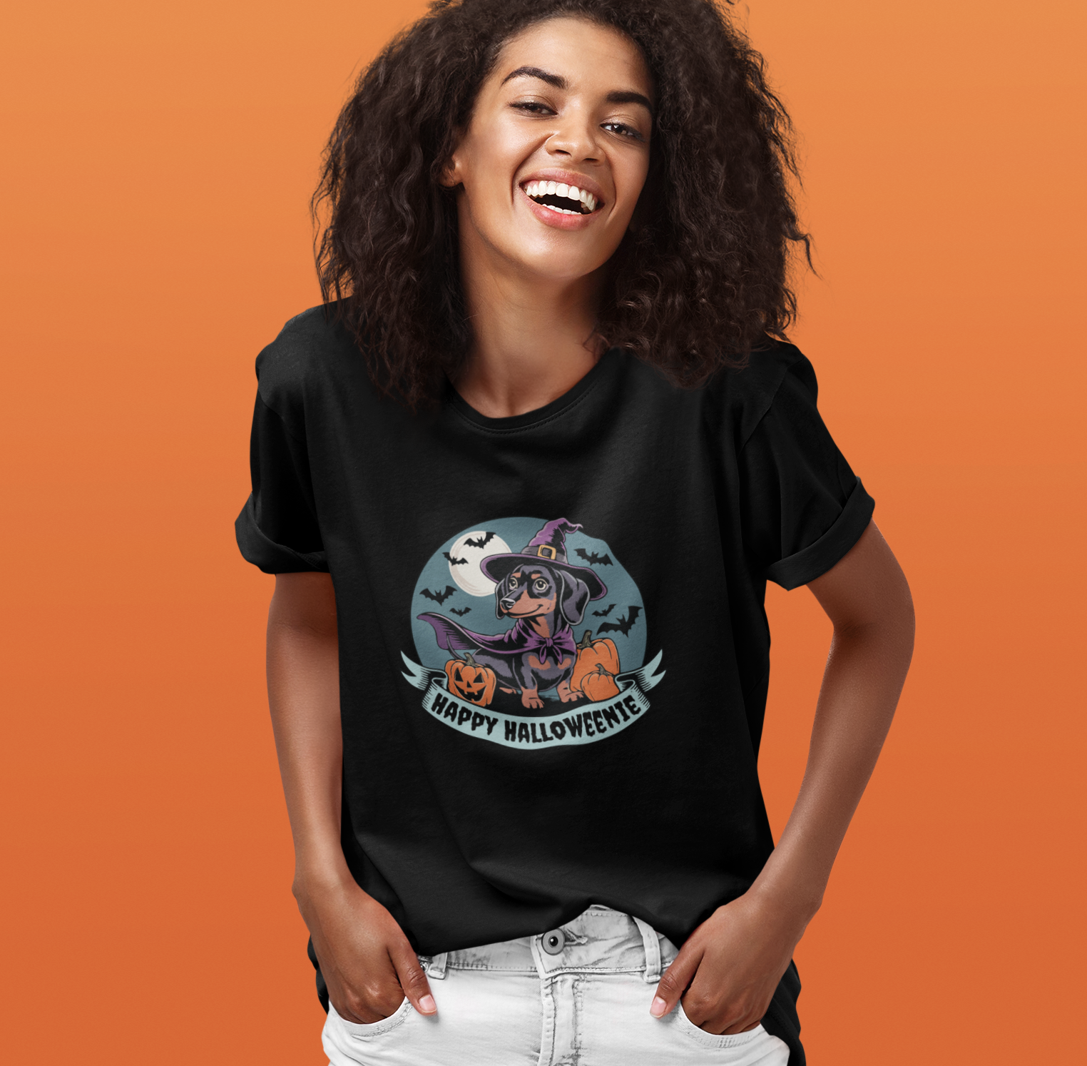 Celebrate Halloween in style with this Happy Halloweenie T-shirt featuring a spooky dachshund weiner dog in a witch hat surrounded by pumpkins and bats. The perfect fun Halloween shirt for those who love dogs and enjoy a touch of spooky humor. Great for Halloween parties, trick-or-treating, or just adding a festive touch to your everyday wardrobe.