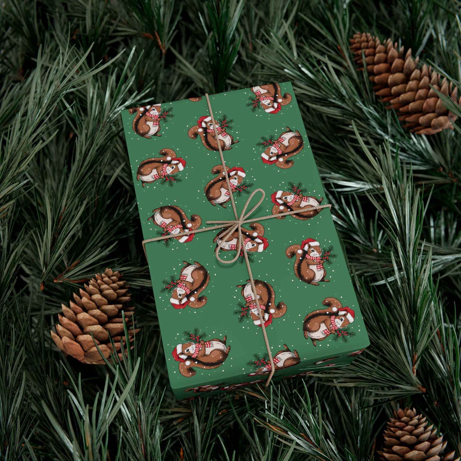 Festive green holiday Christmas wrapping paper featuring a cute squirrel pattern print, perfect for adding a touch of whimsy and cheer to your gift-giving. Satin finish squirrel gift wrap is ideal for those who love nature-inspired designs and want to create a festive atmosphere during the holiday season. Relevant for Christmas, winter celebrations, and holiday gift-giving occasions. Product features - Satin finish wrapping paper