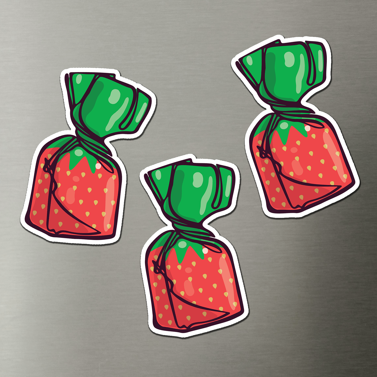 These cute nostalgic Strawberry Hard Candies magnets are the fun way to add some sweetness and character to your fridge, locker, car, or other metal surfaces. Magnets are 2" wide. Bundle includes 3 candy strawberries vinyl magnets. Retro strawberry candies magnets are made of high quality and durable 30 mil vinyl and are suitable for both indoor and outdoor use. These illustrated candy strawberries magnets make a great gift for a sweets lover in your life.