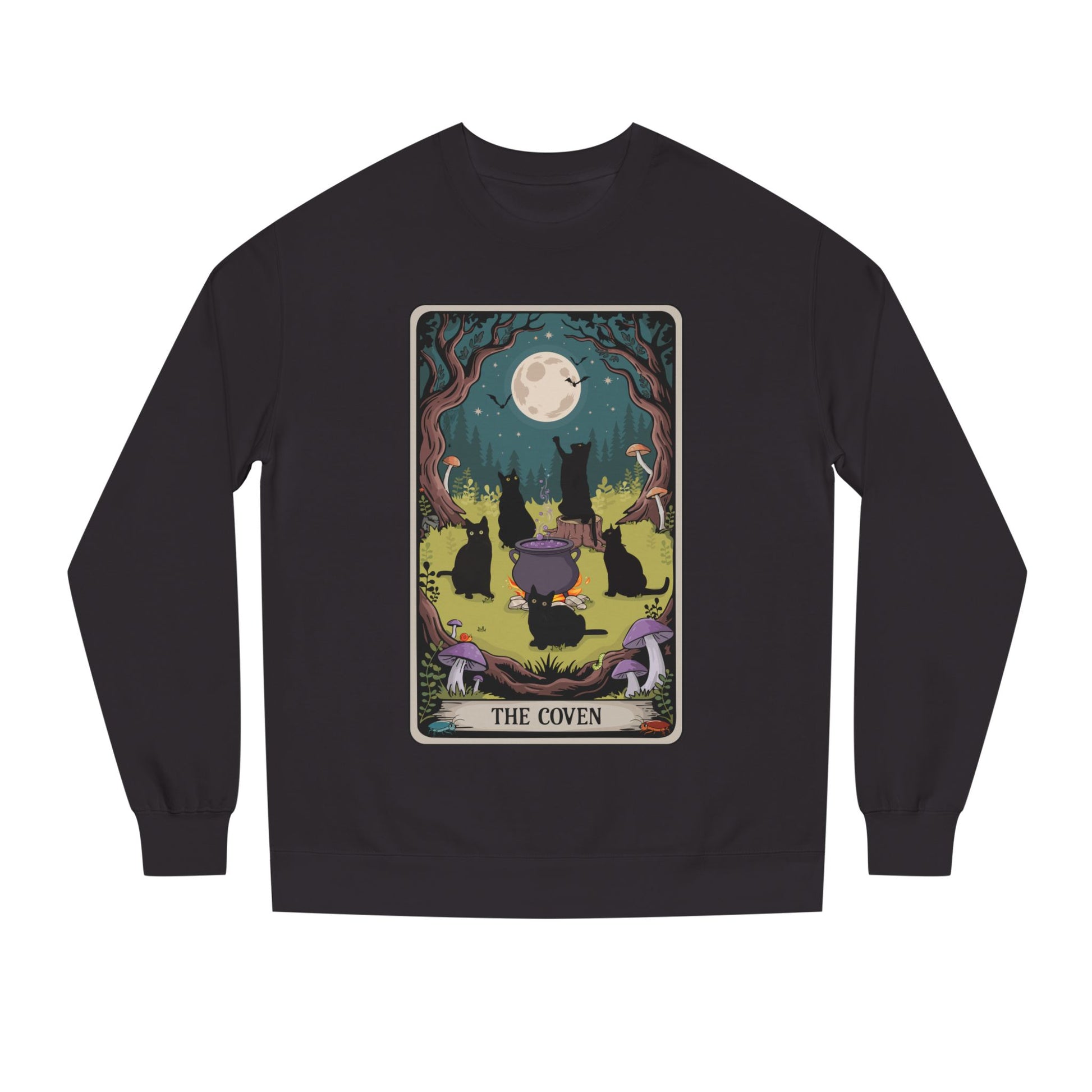 This unisex crewneck sweatshirt features Tarot card inspired artwork "The Coven" with a group of 5 witchy black cats gathered around a cauldron in the forest under the light of the full moon. It exudes magic, witch, Halloween, and goth vibes, perfect for those who love mystical themes and spooky aesthetics. Ideal for Halloween parties, witchy gatherings, or everyday wear for fans of the occult. Embrace cozy vibes with this unisex crew neck sweatshirt, perfect for layering in cooler weather. The unique design exudes a whimsical atmosphere, celebrating the mystical with a charming black cat coven illustration. It’s not just a sweatshirt; it’s a statement piece that fits seamlessly into any laid-back wardrobe. Ideal for individuals who love all things magical, this sweatshirt is perfect for cozy nights in, casual outings, or as a thoughtful gift for friends who appreciate quirky art. Celebrate Halloween, spooky season, or any casual gathering with this comfortable yet stylish garment. A must-have for those who enjoy comfort without sacrificing style. Product features - Made from a soft blend of 80% cotton and 20% polyester for comfort and durability. - Features a stretchable ribbed collar, cuffs, and hem for a perfect fit. - Necktape stabilizes the back seam for added comfort and longevity. - Double needle stitching enhances durability, making it last through many washes. - Medium-heavy fabric (8.5 oz/yd²) provides warmth without sacrificing breathability. Care instructions - Machine wash: cold (max 30C or 90F) - Do not bleach - Tumble dry: low heat - Do not iron - Do not dryclean