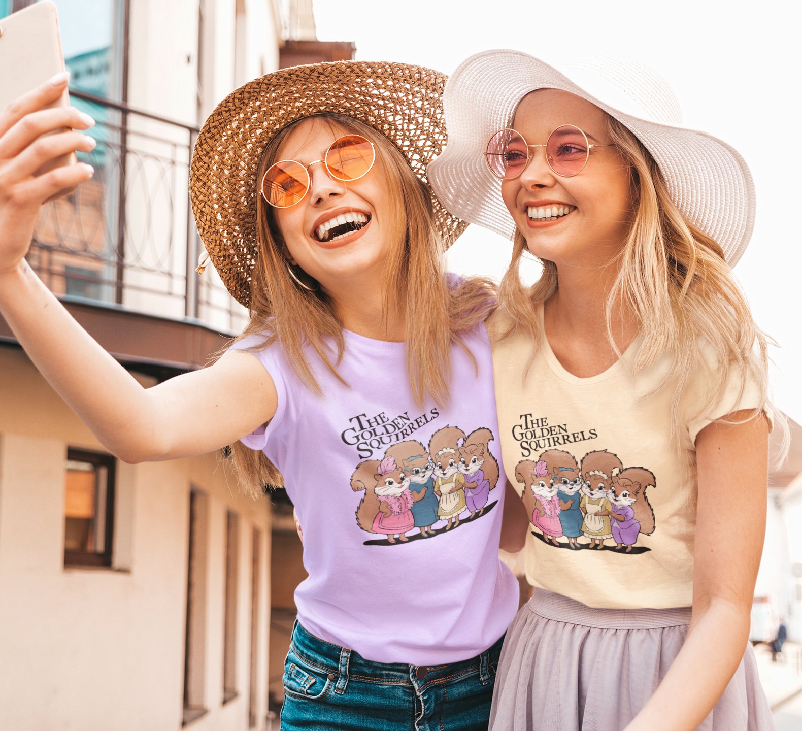 Golden Squirrels womens t-shirt with funny Golden Girls parody of classic 80s TV show with squirrels as the beloved characters. Made to feel like a well-loved favorite, these tees come with a feminine fit that is as stylish as it is comfy. The ribbed knitting makes the collar highly elastic while the twill tape on the shoulder seams stabilizes the back of the shirt and prevents stretching. A great gift for a Golden Girls fan! 100% airlume combed and ringspun cotton (fiber content may vary for different colors). Light fabric (4.2 oz/yd² (142 g/m²)). Slim fit with longer body length. Tear away label, Runs smaller than usual