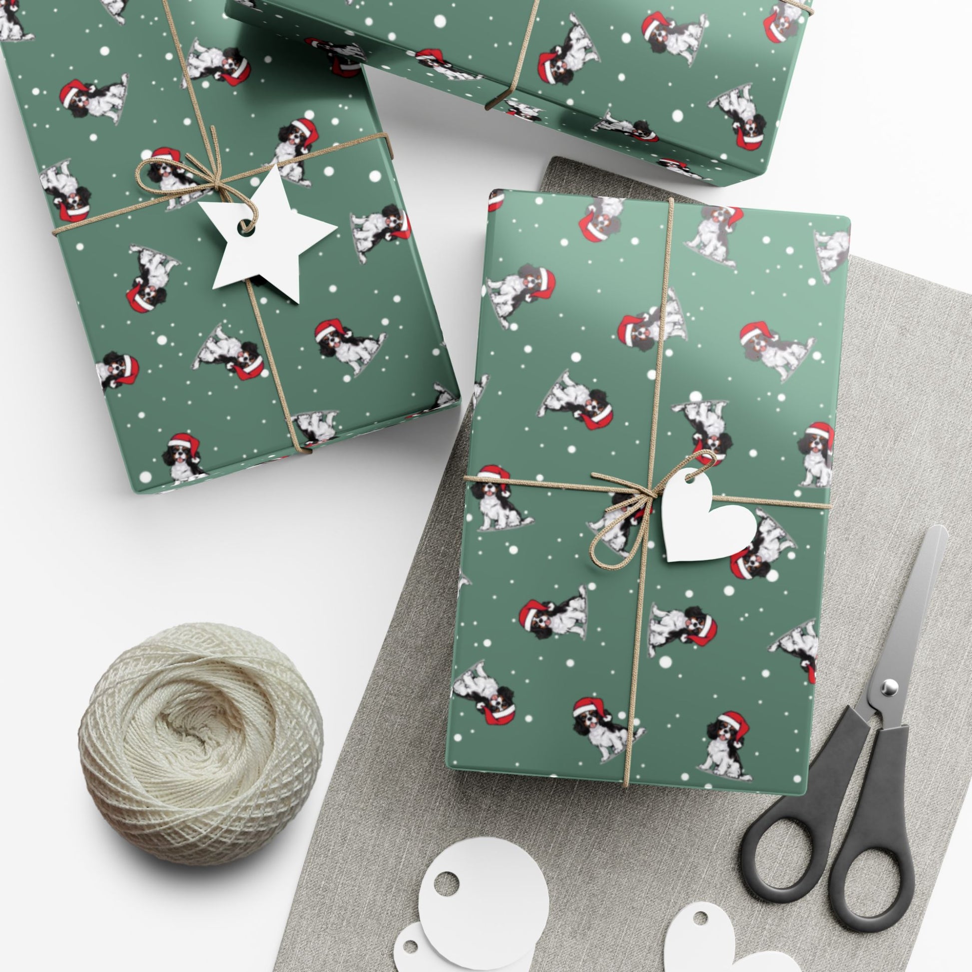 Festive holiday Christmas wrapping paper featuring a cute Tri-color black, brown, and white Cavalier King Charles Spaniel pattern print, perfect for adding a touch of whimsy and cheer to your gift-giving. Satin finish Cavalier King Charles Spaniel gift wrap is ideal for those who love animal designs and want to create a festive atmosphere during the holiday season. Relevant for Christmas, winter celebrations, and holiday gift-giving occasions. Product features - Satin finish wrapping paper. The perfect holiday wrapping paper to wrap Christmas gifts for your Cavalier King Charles Spaniel owner friends and family.