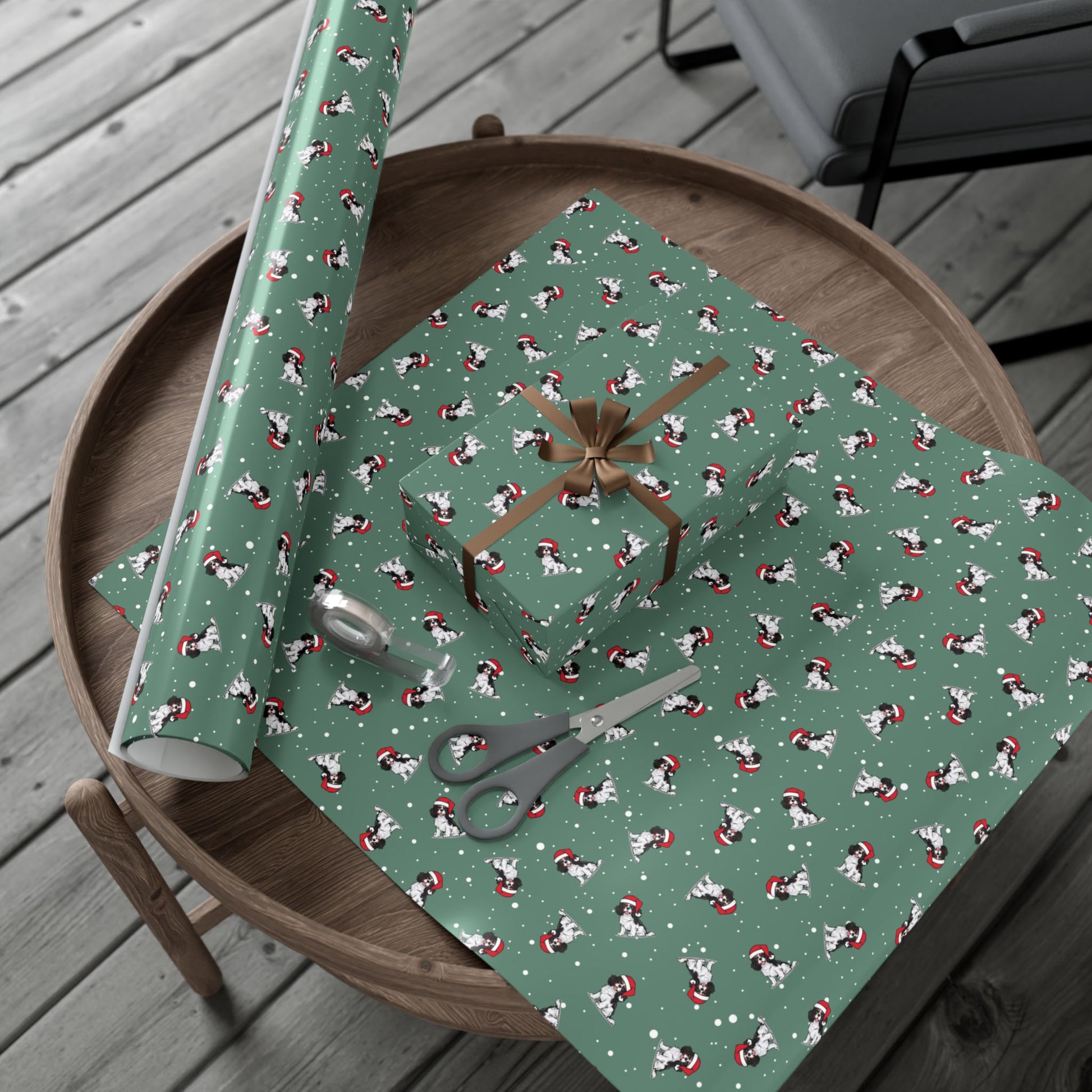 Tricolor Cavalier King Charles Spaniel Dog Christmas Wrapping Paper, Dogs Print, Cheery Holiday Gift Wrap With Snowy Xmas Puppy In Santa Hat