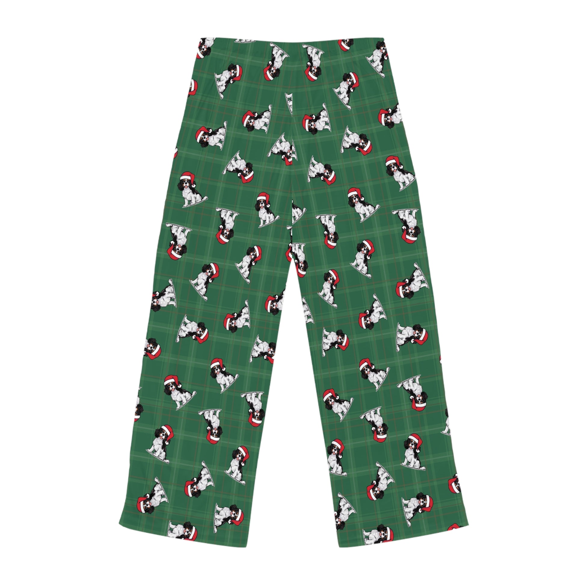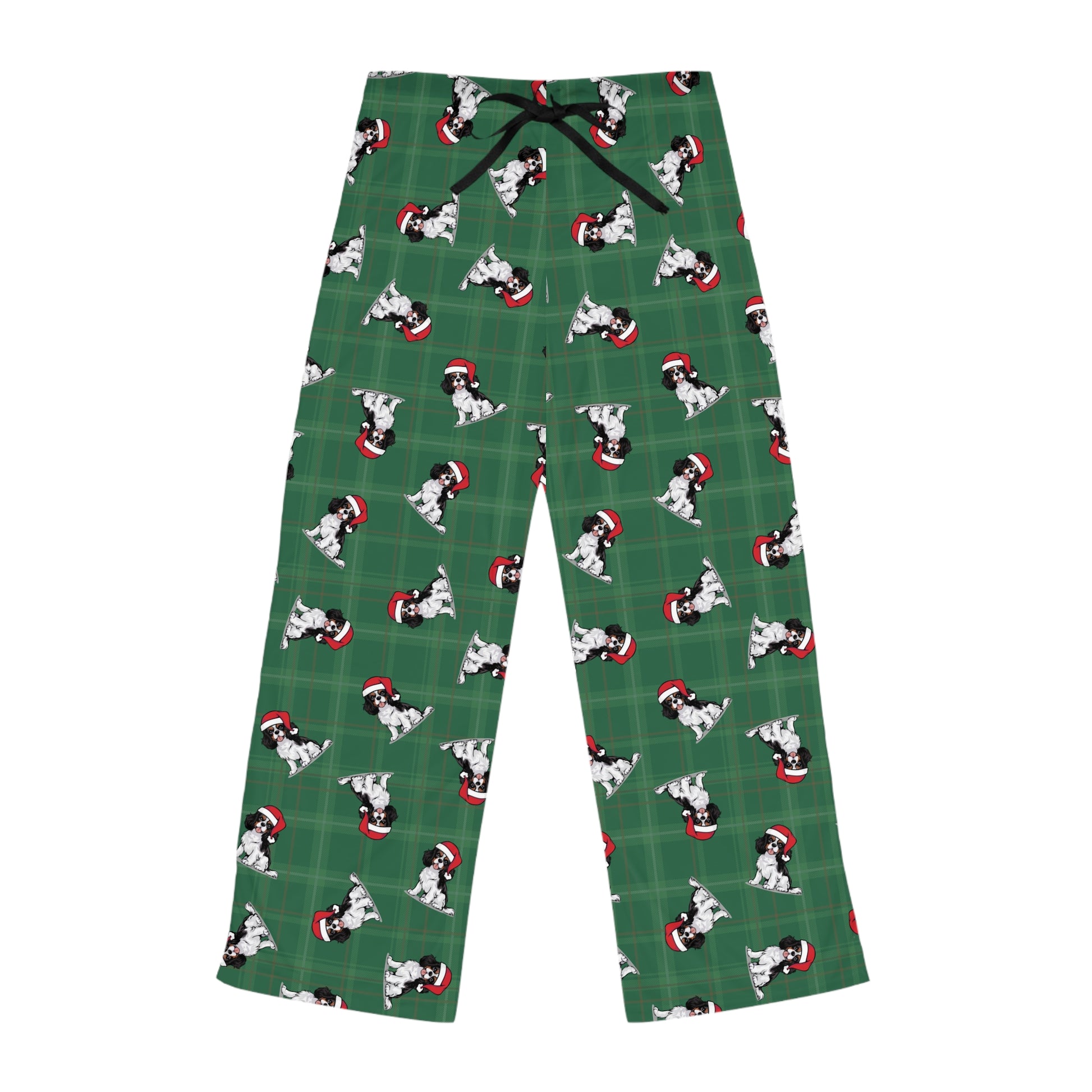 Tricolor Cavalier King Charles Spaniel Dog Womens Christmas Pajama Pants, Santa Dogs Green PJ Bottoms