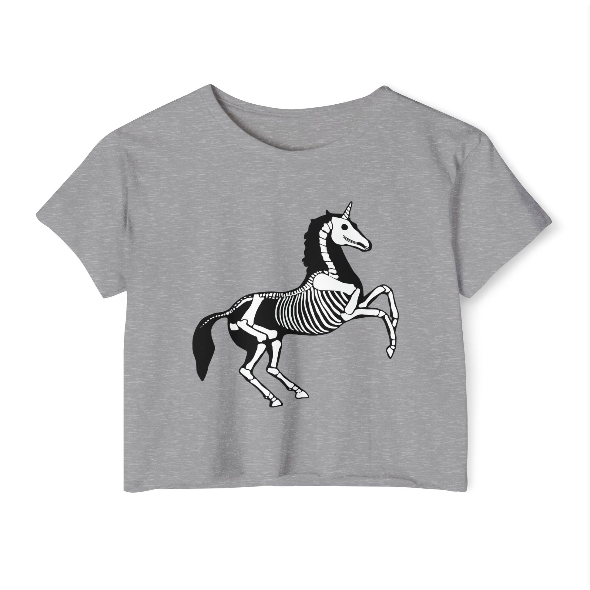 Unleash your inner dark unicorn with this Skeleton women's crop top. Perfect for Halloween, this cropped shirt has a spooky yet whimsical vibe that will make you stand out at any festival or party. Ideal for women who enjoy unique and edgy fashion, this crop top is a must-have for Halloween festivities.