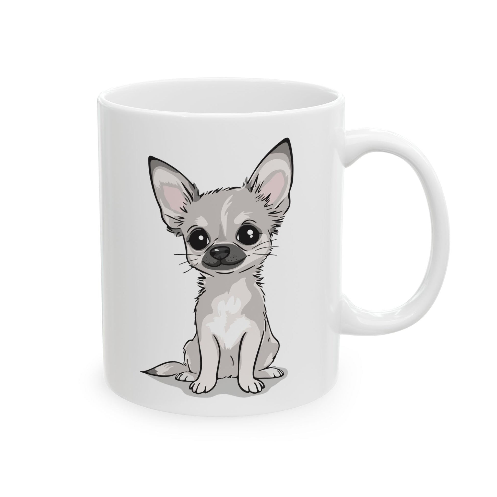 Warm-up with a nice cuppa out of this cute white chihuahua puppy dog print ceramic coffee mug. It’s BPA and Lead-free, microwave & dishwasher-safe, and made of white, durable ceramic in 11-ounce size. Great gift idea for a chihuahua owner or a dog lover.