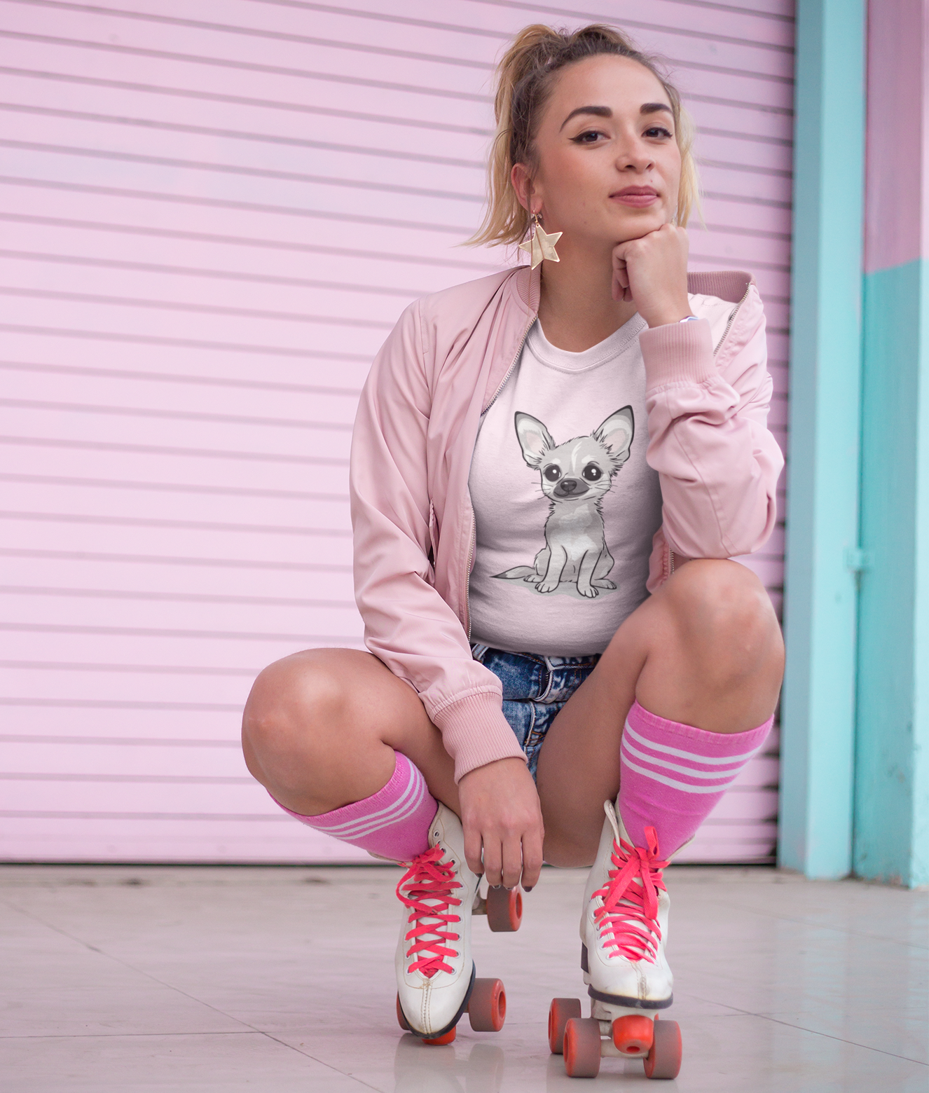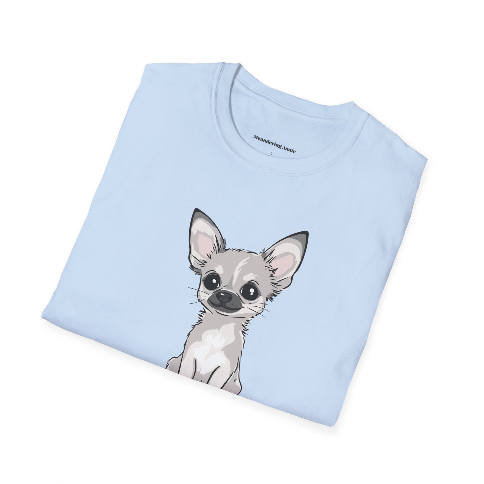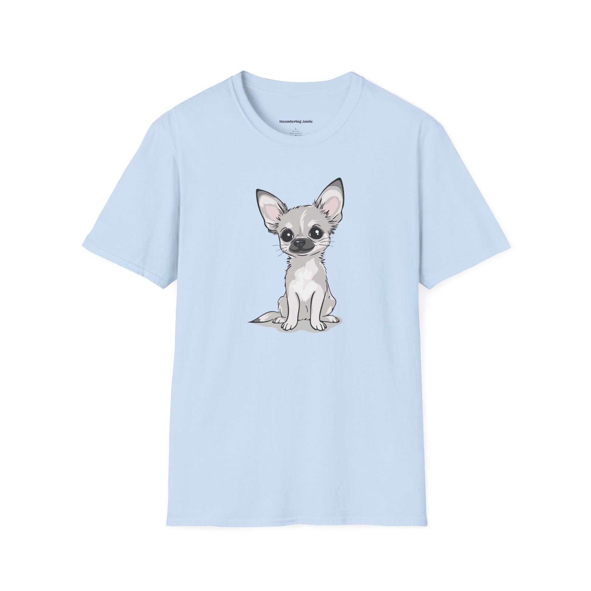 The unisex white chihuahua puppy dog soft-style t-shirt puts a new spin on casual comfort. Made from very soft materials, this tee is 100% cotton for solid colors. Heather colors and sports grey include polyester. The shoulders have twill tape for improved durability. There are no side seams. The collar is made with ribbed knitting to prevent curling damage. Perfect gift for a dog lover or a chihuahua owner.