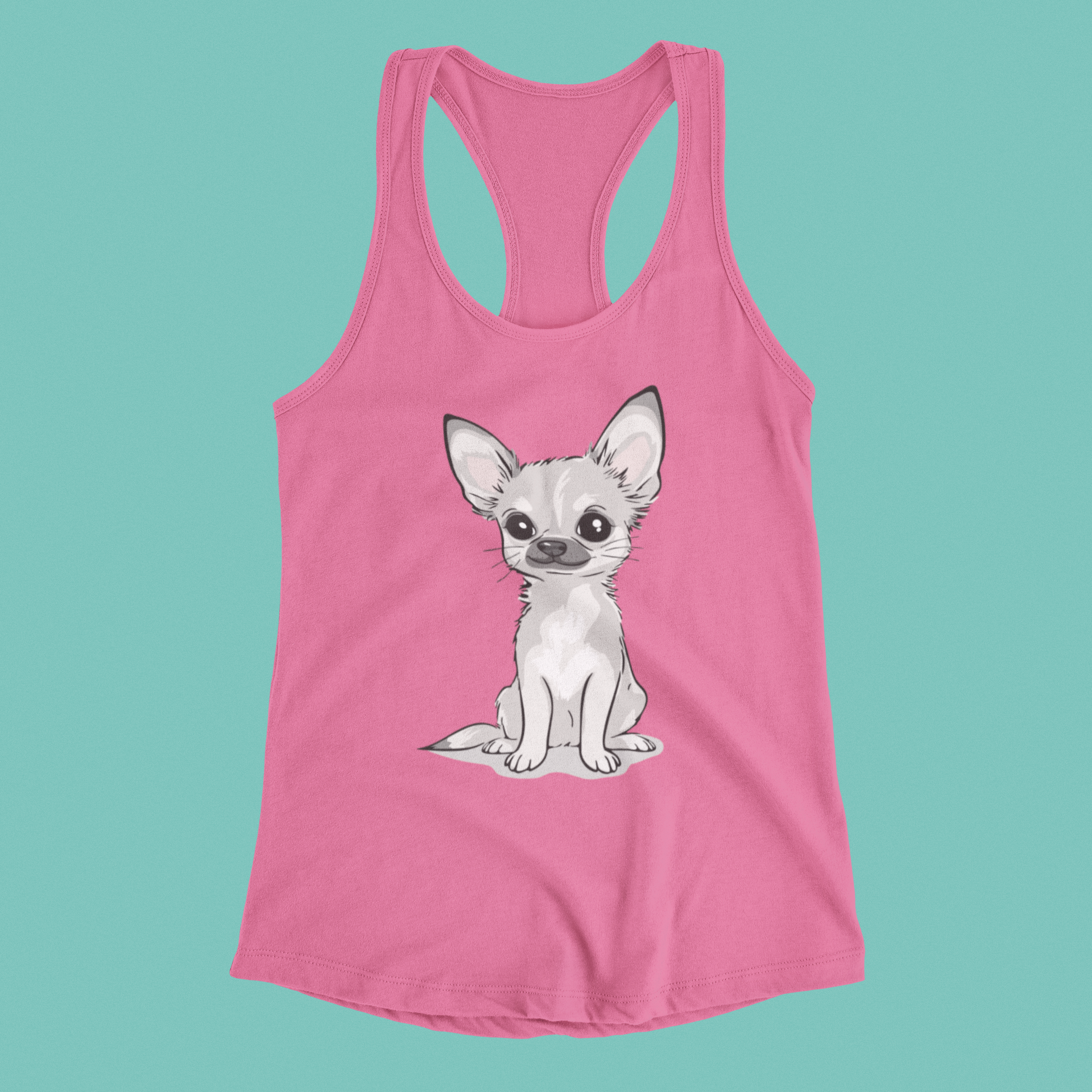 A must-have in every woman's wardrobe, this white chihuahua puppy dog print fitted tank-top looks good in a gym or out in town. Fine quality print will serve as a statement for a long time. Makes a great gift idea for a dog lover or a chihuahua owner in your life.