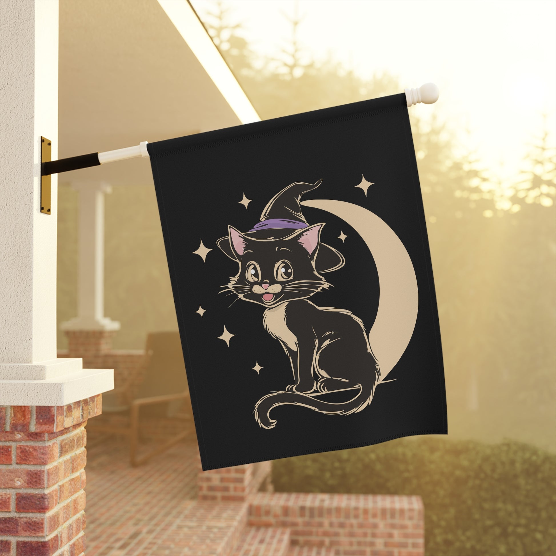 A spooky and magical Halloween outdoor yard banner flag featuring artwork of a retro style cat wearing a witch hat. Perfect for anyone who loves Halloween and mystical, goth vibes, this witchy kitten outdoor flag is ideal for adding a touch of spooky enchantment to your seasonal home decor.