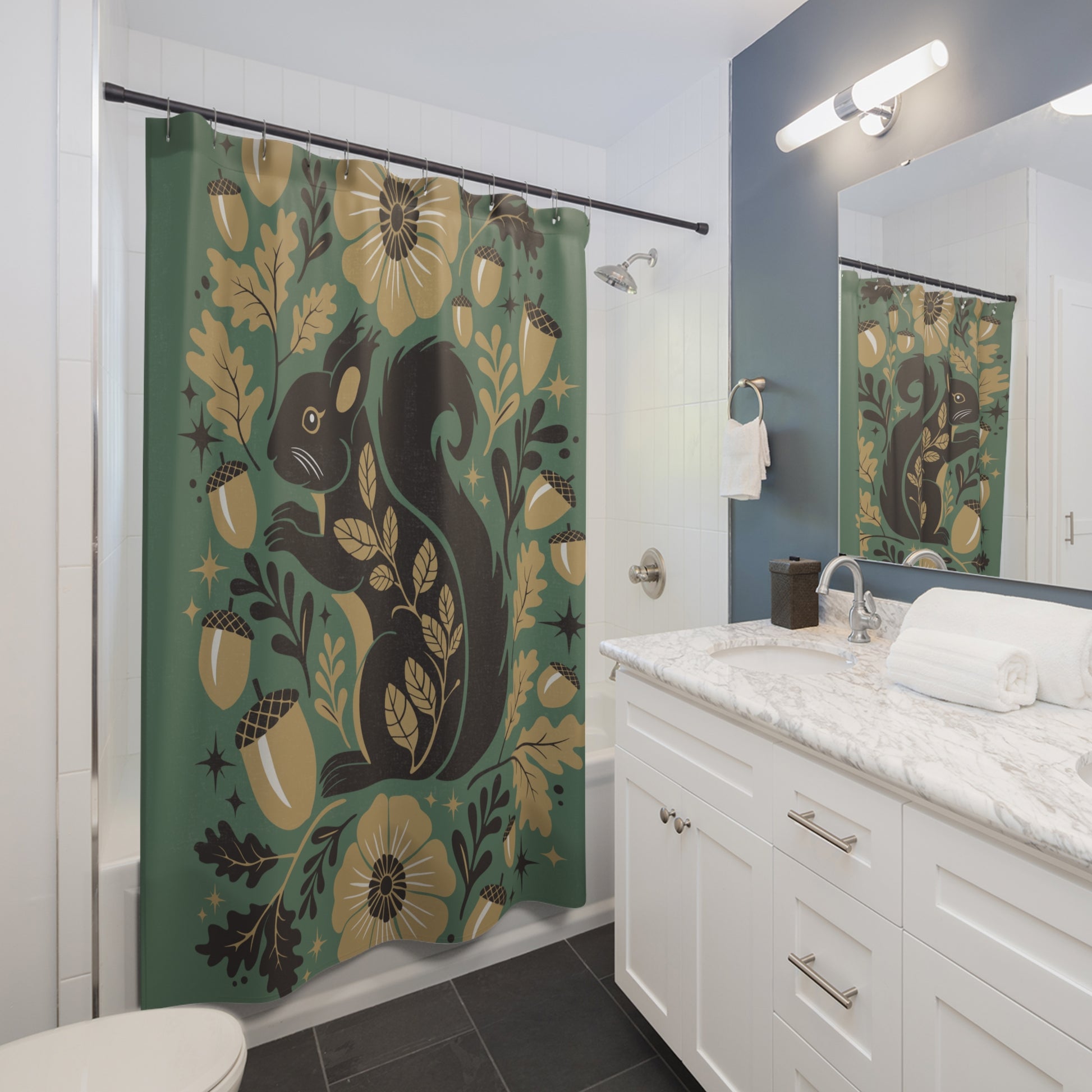 Bring a magical forest story into your bathroom with this richly illustrated floral squirrel shower curtain. A sleek black squirrel curls among golden blooms, acorns, and delicate leaves against a deep green backdrop, the palette feels warm, grounded, and a little whimsical. The fabric hangs with a soft drape and repels moisture, turning daily routines into a small, comforting ritual. It adds personality to a nature-inspired powder room, complements wood and brass accents, and creates a calm backdrop for slow mornings and cozy evenings. Shower curtain size: 71" × 74"
